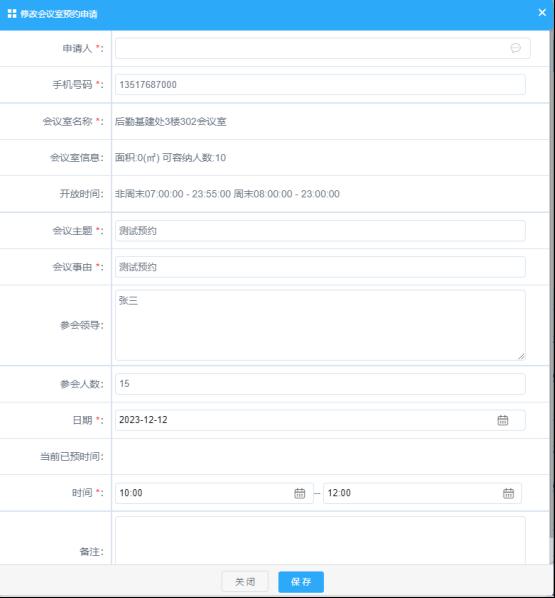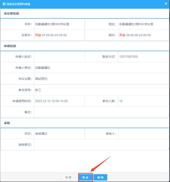 对于预约成功的申请需修改或撤销,通过点击预约条目进入预约详细信息页面,在底部有“修改”和“撤销”按钮,点击“修改”进入修改状态对相应的信息进行修改(如下图);点“撤销”将撤销本次预约。
