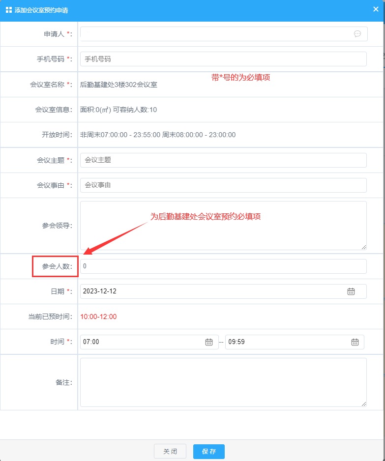 (三)、按照列表,填写相应的栏目,带*号的是必填栏目,后勤基建处的会议室预约必须填写参会人数(如下图)。