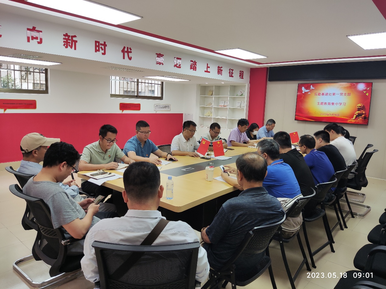 5月18日,后勤基建处第一党支部学习贯彻习近平新时代中国特色社会主义思想主题教育专题集中读书学习会在学生公寓东29栋多功能活动室举行。
