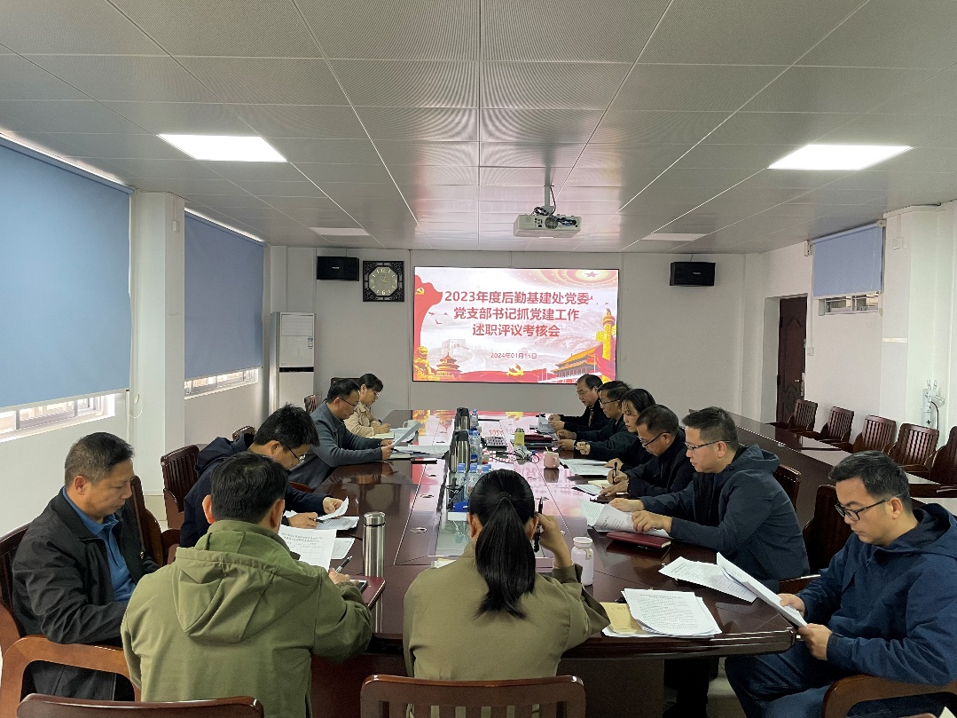 为深入贯彻落实习近平新时代中国特色社会主义思想和党的二十大精神,强化基层党支部书记责任意识和履职意识,压紧压实党建工作责任制链条,推进党建工作高质量发展,1月15日后勤基建处党委召开2023年度党支部书记抓党建工作述职评议考核会。后勤基建处第一党支部书记严壮锋和第二党支部书记徐华分别进行现场述职,后勤基建处党委班子、纪委班子及党员代表参加会议并对2023年党支部书记工作进行现场评分。会议由后勤基建处党委书记余波主持。