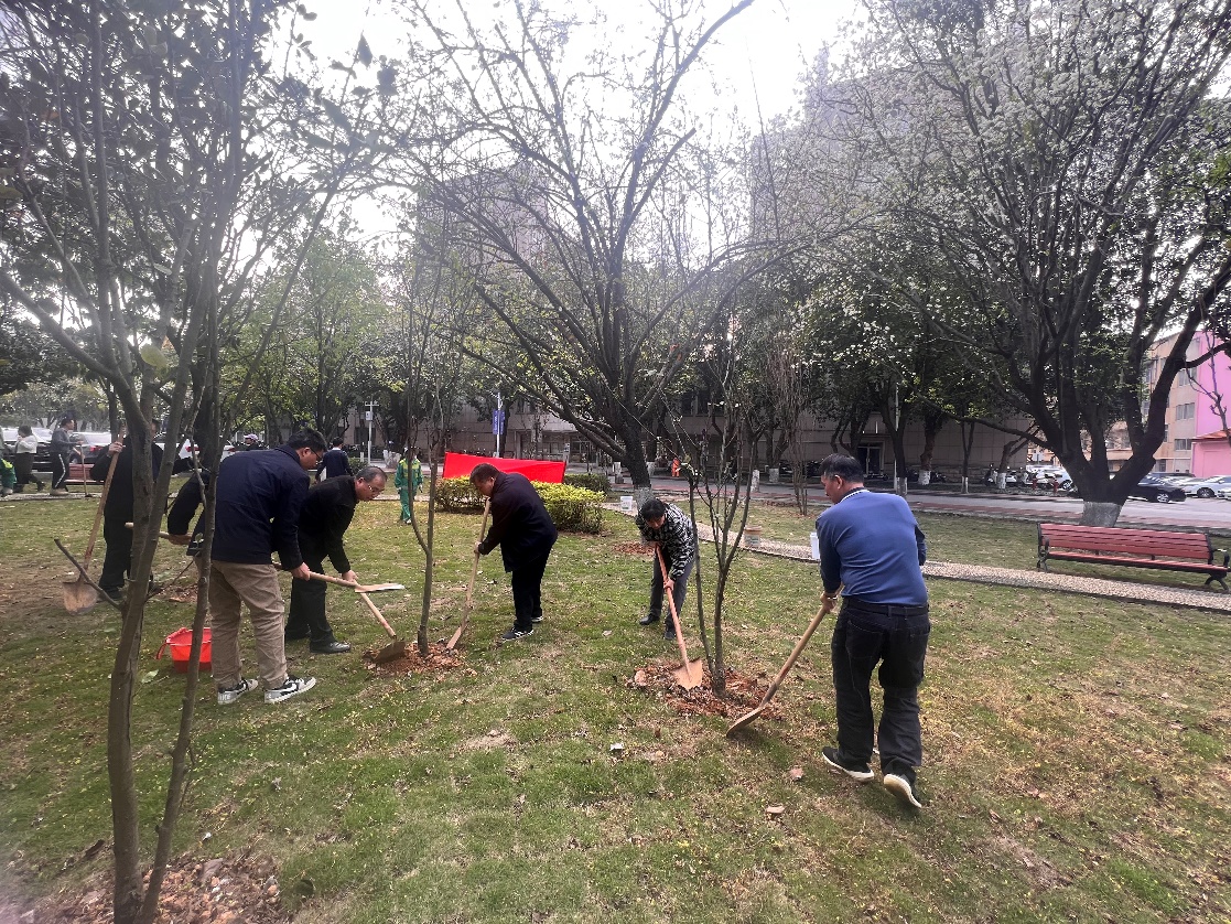 活动当天,党员们分工协作,有的挥锹培土,有的施肥浇水,经过大家的精心护理,沙梨园变得干净整洁,绿树焕新颜,为春日的校园增添了一抹生机。