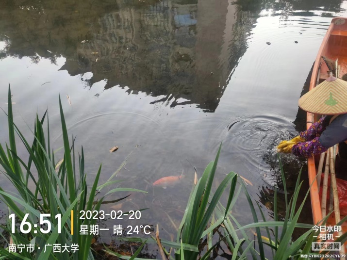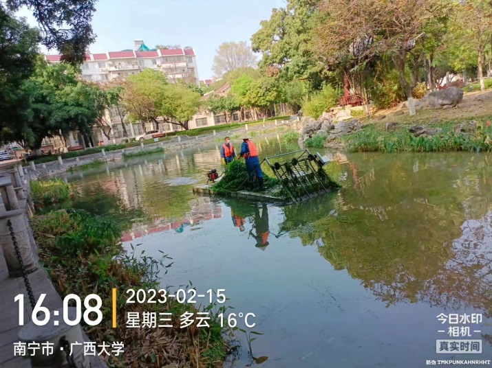 持续推进16个景观湖和4个景观池湖水治理工作。持续做好水面保洁、鱼苗投放、水草补种、景观池打扫、鱼类防控、污水入湖治理、设备设施巡检、查看调蓄池水位情况、更换新警示牌等工作。运维员每日进行水面保洁巡检,保洁内容包括漂浮物拦截和清理、水上漂浮物打捞、湖岸边积聚物的清理、湖中野生杂草的清除,保证水面无明显白色垃圾、无大面积枯枝落叶及杂物。伞状地笼与长型地笼进行控鱼常态化放置,提高水质透明度,防控湖体罗非鱼生长;在月牙湖修剪过长水草及围网打捞断草;翠湖驳岸枯萎花带修剪,拔杂草;观月湖修剪狐尾藻,投放芽孢杆菌调理水质;爱莲湖放药治理蓝绿藻;镜湖,莲湖打捞水底青苔;观月湖控鱼,总计打捞上浮杂鱼270斤,期间投放漂白粉去味消毒;爱莲湖投放生石灰改善水质,及降水到彩蝶湖稀释水质;鉴湖、莲湖放药治理福寿螺并及时打捞;大碧云湖、紫荆湖南端、绿榕湖进行补水;汇学堂水池投放5条红鱼,镜湖、鉴湖、翠湖、荷湖各投放2条红鱼,莲湖、紫荆湖南端、劝学岛各投放1条红鱼;同时人员卫生消毒、湖泊垃圾清运等工作有序进行,16个景观湖和4个景观池总计清运垃圾40吨。
