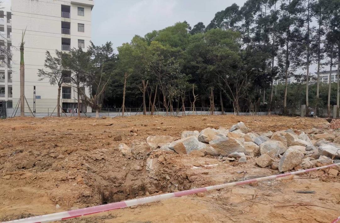 项目进度:土方外运,树木移植,基础开挖。