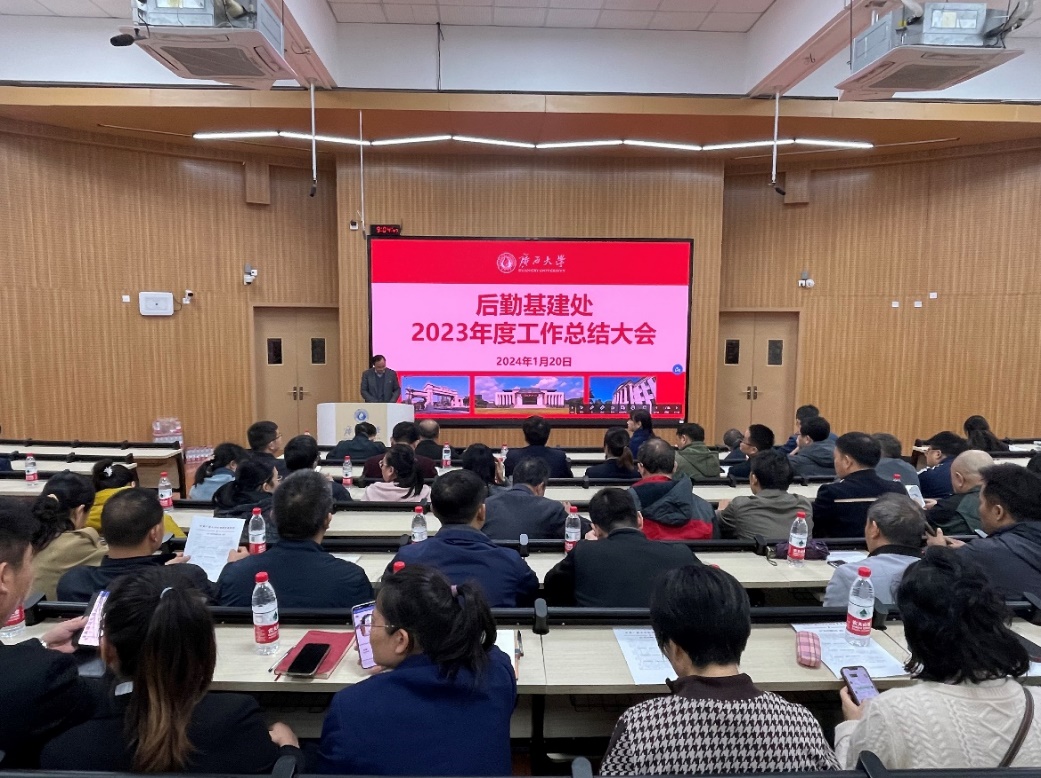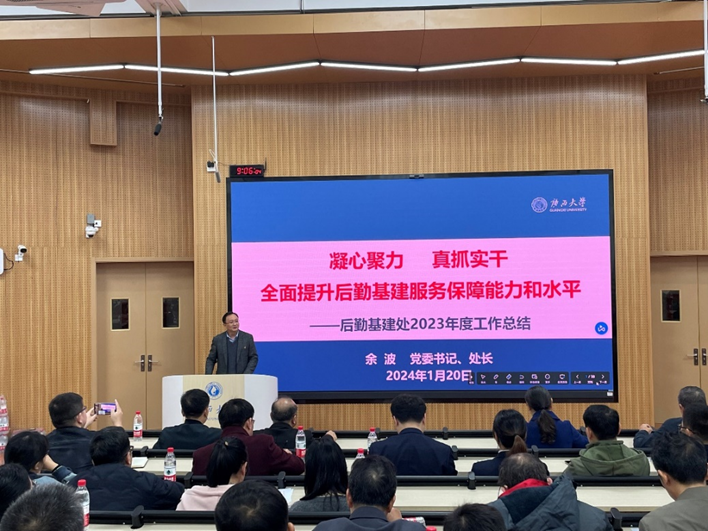 首先,余波党委书记、处长代表领导班子作后勤基建处2023年度工作总结,总结后勤基建处2023年度在党建业务双融合、公寓园区生活服务、教育教学公共服务保障、重大活动保障、水电运行与服务、设备维修服务、公共楼宇维修改造及重大项目推进等方面工作完成情况,凝练工作亮点及通报获得荣誉,并对2024年重点工作做了详细部署。余波肯定全体教职员工过去一年取得的成绩,并对每一位教职员工提出殷切期望:一是进一步增强工作责任心,提升“事事紧抓快干”的紧迫感,积极主动解决师生“急难愁盼怨”问题;二是围绕学校中心工作,进一步提高各业务办公室的协同联动,形成齐抓共管的工作格局;三是继续保持2023年团结一致、真抓实干、敢拼敢闯的势头,以久久为功的定力和韧劲推动后勤服务保障和校园基本建设工作高质量发展,全面助力学校“双一流”建设工作。