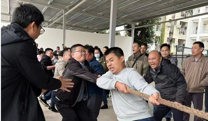 本次活动会共设置了4个活动项目,分别为: 拔河比赛、托乒乓球接力、套圈、幸运抽奖。后勤基建处处领导与教职工随机组成4组,校财务处、审计处、国实处教职工代表组成1组,三大物业公司代表各组成3组,共8组队伍共同参赛。每一个活动项目都呈现不同的趣味特点,既培养了大家的团结一心、坚持到底的意志品质,也考验大家团结协作的能力。尤其是拔河比赛的决赛,由后勤基建处3组对丹田物业组。比赛一波三折,势均力敌,加油声震耳欲聋。摆绳随着加油声有节奏的在两边来回走动、停留,最终后勤基建处3组获得了拔河比赛的冠军,丹田物业获得亚军,财务审计国实组获得季军。从拔河比赛到抽奖活动,参赛的每一位同事都笑容满面,他们彼此加油、欢呼、呐喊,现场欢声笑语此起彼伏,真实体现了大家极大的热情。活动项目上我们看到了平日里各个同事的另一面风采,胜利时他们也会如孩子般在场上欢呼雀跃,在赛场上尽情挥洒着汗水,释放着激情。