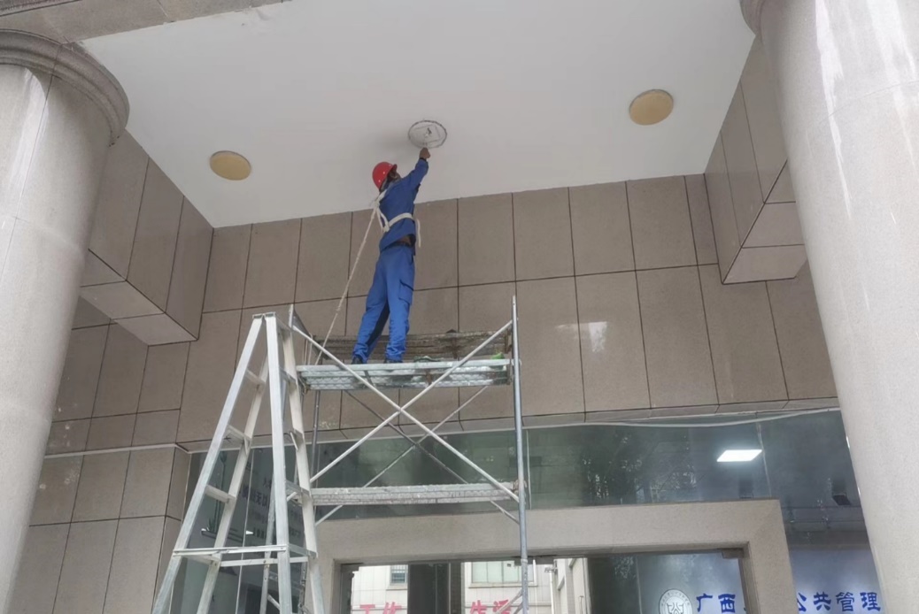 项目概况:综合实验大楼中庭高度约21米,吊顶面积约1500平方米,中庭吊顶的铝塑板有脱落、松动和鼓包现象,存在较大安全隐患。