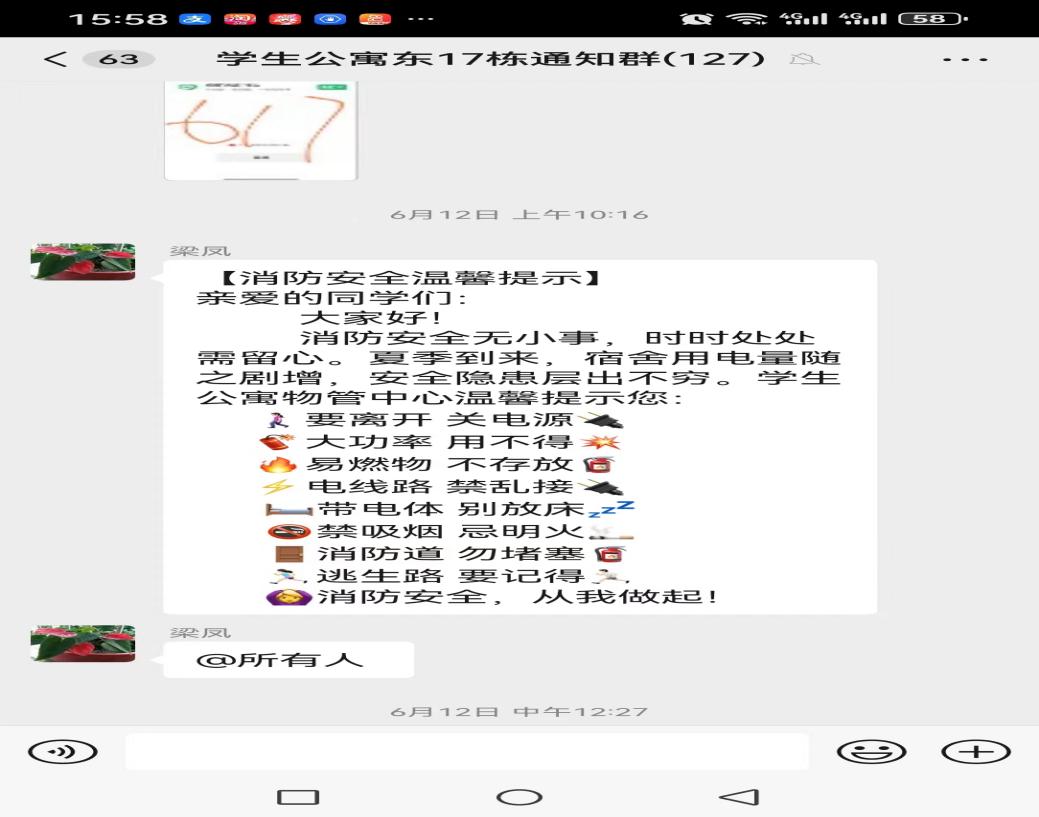 6月份,学生公寓积极响应国家安全生产号召,提高学生公寓的安全管理水平,开展了一系列安全生产活动: