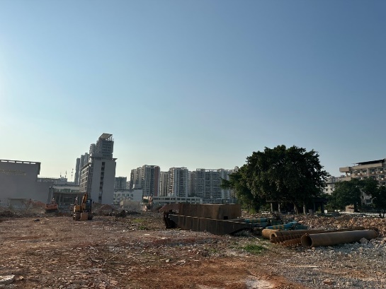 已完成项目办公楼,南面施工围墙、八图一牌、公益宣传广告。场地清表、平整施工。