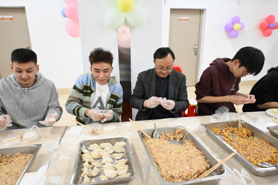 后勤基建处党委副书记、处长余波与同学们一起包饺子