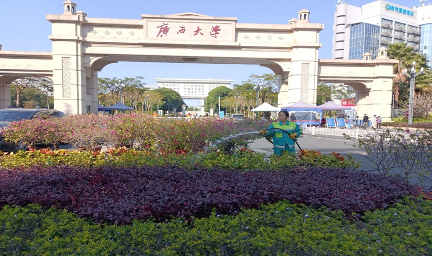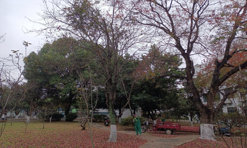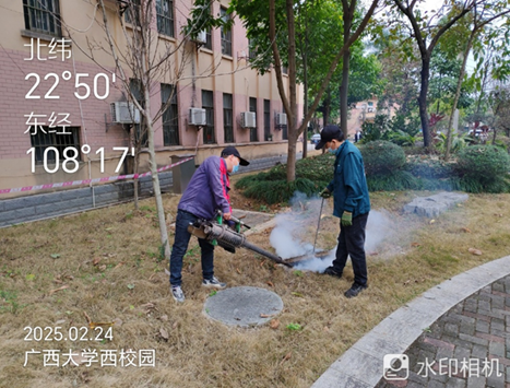 22.开展“扫尘除旧,喜迎新春”校园环境卫生整治专项活动。春节前夕,后勤基建处组织环卫工作全面细致地开展迎春大扫除,对校内各区域危树死树进行巡查及处理,并做好校园各区域绿地盆栽淋水等工作,以整洁优美舒适的校园面貌迎接蛇年新春。1-2月对学生公寓园区绿化养护覆盖面积约107000万平方米;清除杂草面积约62300平方米;草坪、麦冬、小驳骨等绿植补种面积约410平方米;修剪绿植面积约40700平方米;修剪各类树木枯枝、低枝及靠近建筑物树枝92棵;绿地及树木病虫害防治消杀约51000平方米,美化学生居住环境。