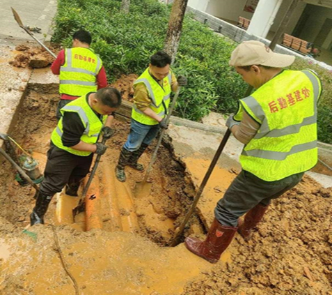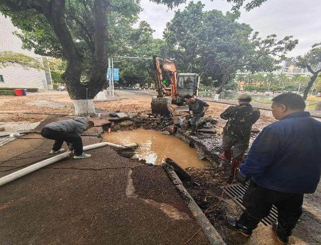 抢修办公南楼前破裂总水管 抢修学生公寓31栋前破裂总水管