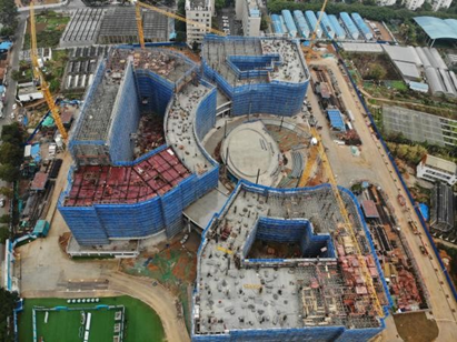 (1)地下室外墙防水、土方回填和地下室汽车坡道结构施工完成;(2)1区二层墙柱钢筋绑扎完成,墙柱模板安装及加固完成,三层梁板模板安装完成,梁筋绑扎完成;(3)2区一层墙柱,二层梁板混凝土浇筑完成;(4)3区二层墙柱钢筋绑扎完成,三层梁板满堂支模架搭设完成及模板安装完成50%。