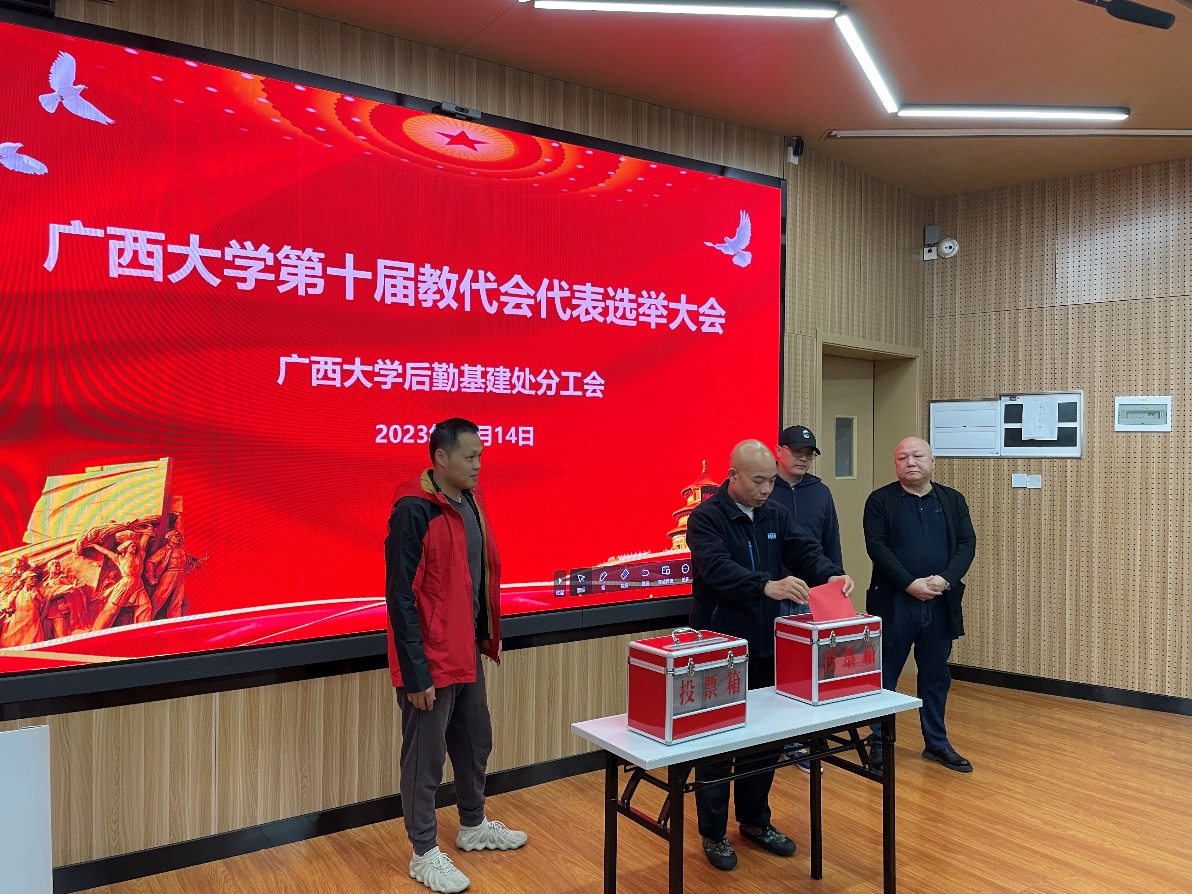 大会审议通过《后勤基建处分工会工作报告》《后勤基建处分工会会费使用情况报告》《后勤基建处分工会新一届委员会委员选举办法(草案)》《后勤基建处出席beats365亚洲版工会第十三届会员代表大会代表(草案)》,通过大会监票员、计票员和唱票员名单,严格按照选举程序,采用无记名投票方式,选举产生7名后勤基建处分工会新一届委员会委员和3名出席beats365亚洲版工会第十三届会员代表大会代表。
