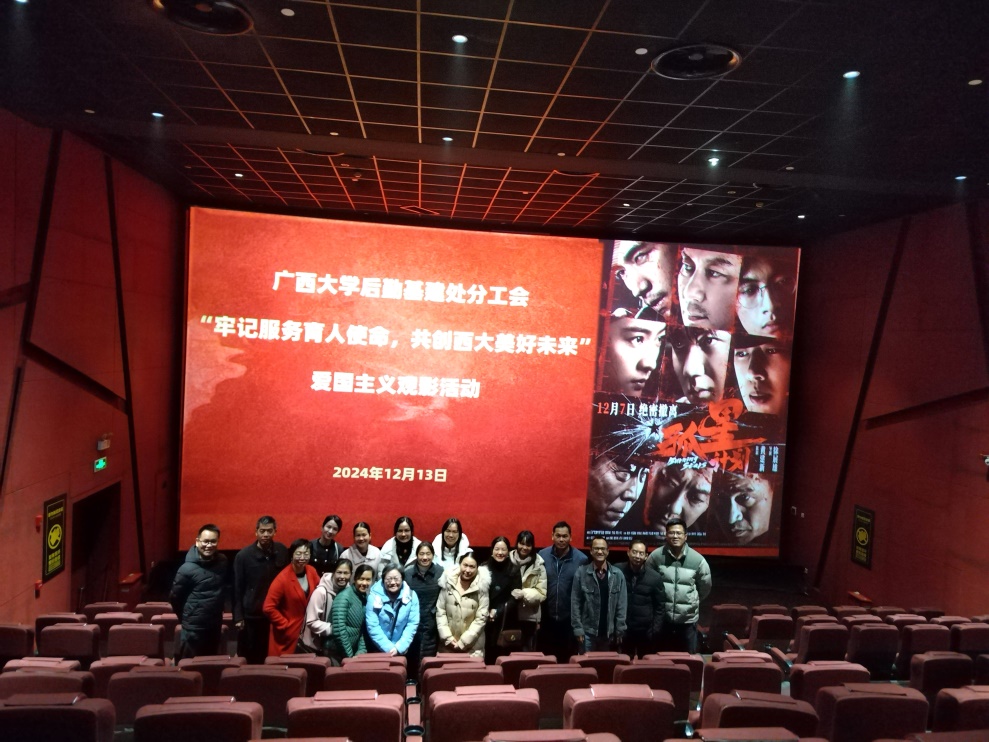 为加强爱国主义教育,后勤基建处分工会于12月13日国家公祭日组织处工会会员观看《孤星计划》活动。该电影讲述了一群爱国青年在上世纪20年代白色恐怖蔓延的上海,为营救爱国人士撤离,团结一心,不惧困难,冒着敌人的枪林弹雨,突破重重围剿,完成了撤离任务,实现了人生的淬炼。此次活动,我处教职工汲取了革命的力量,激发了积极进取的热情,并纷纷表示吾辈要勿忘国耻、奋斗自强,铭记历史、不忘过去,珍爱和平、开创未来。在日常工作中,牢记服务育人使命,勇于担当作为,开创西大美好未来,助力学校“双一流”建设,为学校高质量发展贡献自己的力量。