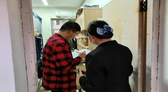 2月15日学生公寓工作人员、土建管理岗、园林绿化技术岗、物业服务人员、学生代表开展月检工作。