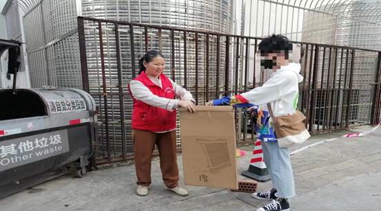垃圾分类督导员引导同学们分类投放垃圾