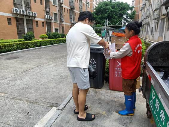 垃圾分类督导员引导同学分类垃圾
