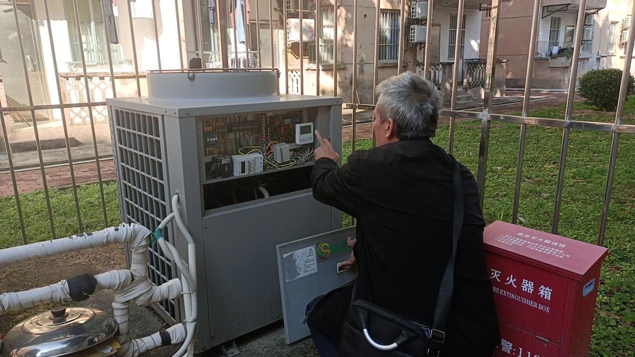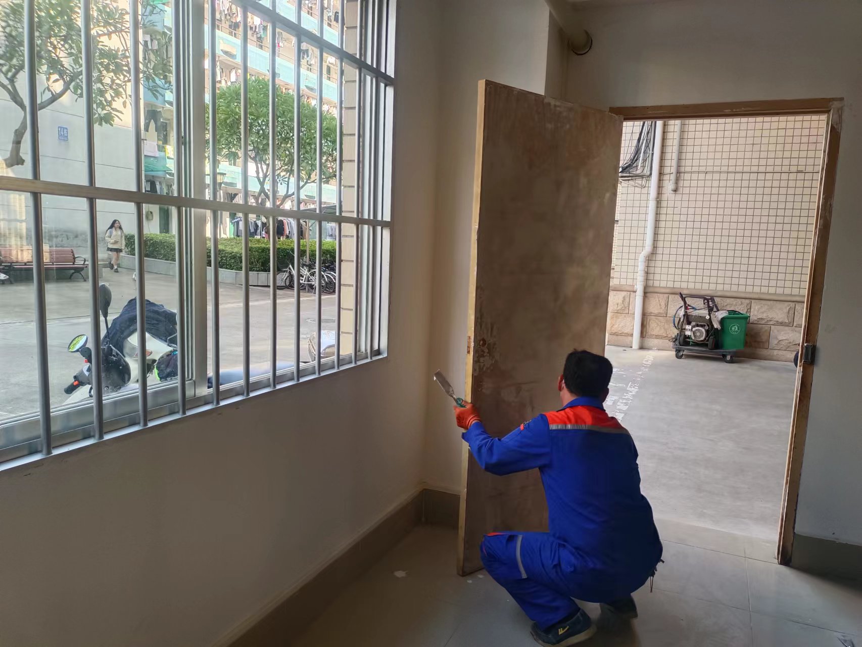 工作人员和施工方到东27栋b226宿舍处理宿舍门口天花板漏水问题