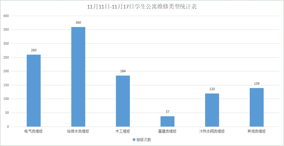 2023年11月11日-17日后勤服务24小时报修中心接电话报修、网上报修、现场报修1467单,其中学生公寓报修1100单(已完工1082单,完工率98.3%,余18单在维修中),其中电气类260单,木工类184单,给排水类360单,基建类37单,冷热水阀类120单,其他类139单,余下367单由其他岗位负责完成维修;在做好每天日常维修的同时,坚持对学生公寓183间电表房, 2个水泵房每天巡检。