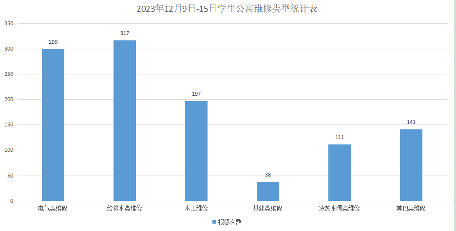 2023年12月9日-2023年12月15日后勤服务24小时报修中心接电话报修、网上报修、现场报修1535单,其中学生公寓报修1103单(已完工1062单,完工率96.3%,余41单在维修中),其中电气类299单,木工类197单,给排水类317单,基建类38单,冷热水阀类111单,其他类141单,余下432单由其他岗位负责完成维修;在做好每天日常维修的同时,坚持对学生公寓183间电表房, 2个水泵房每天巡检。
