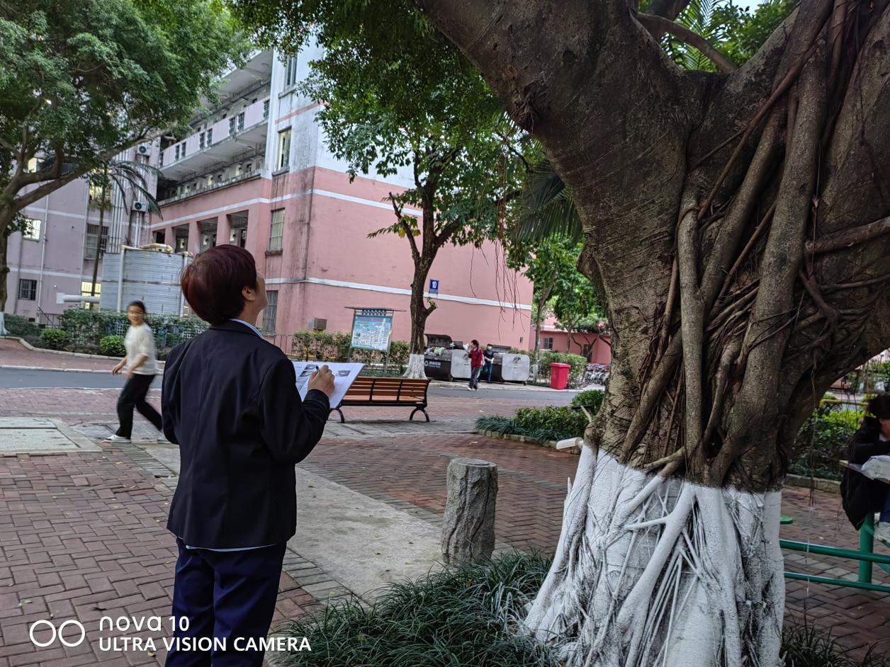 工作人员进行学生公寓高大树木安全隐患排查工作
