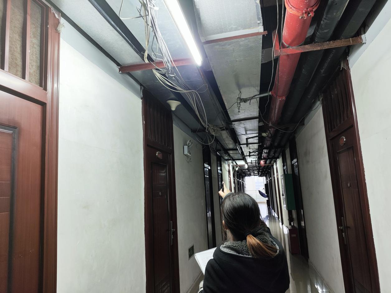 工作人员排查楼栋网络线杂乱情况
