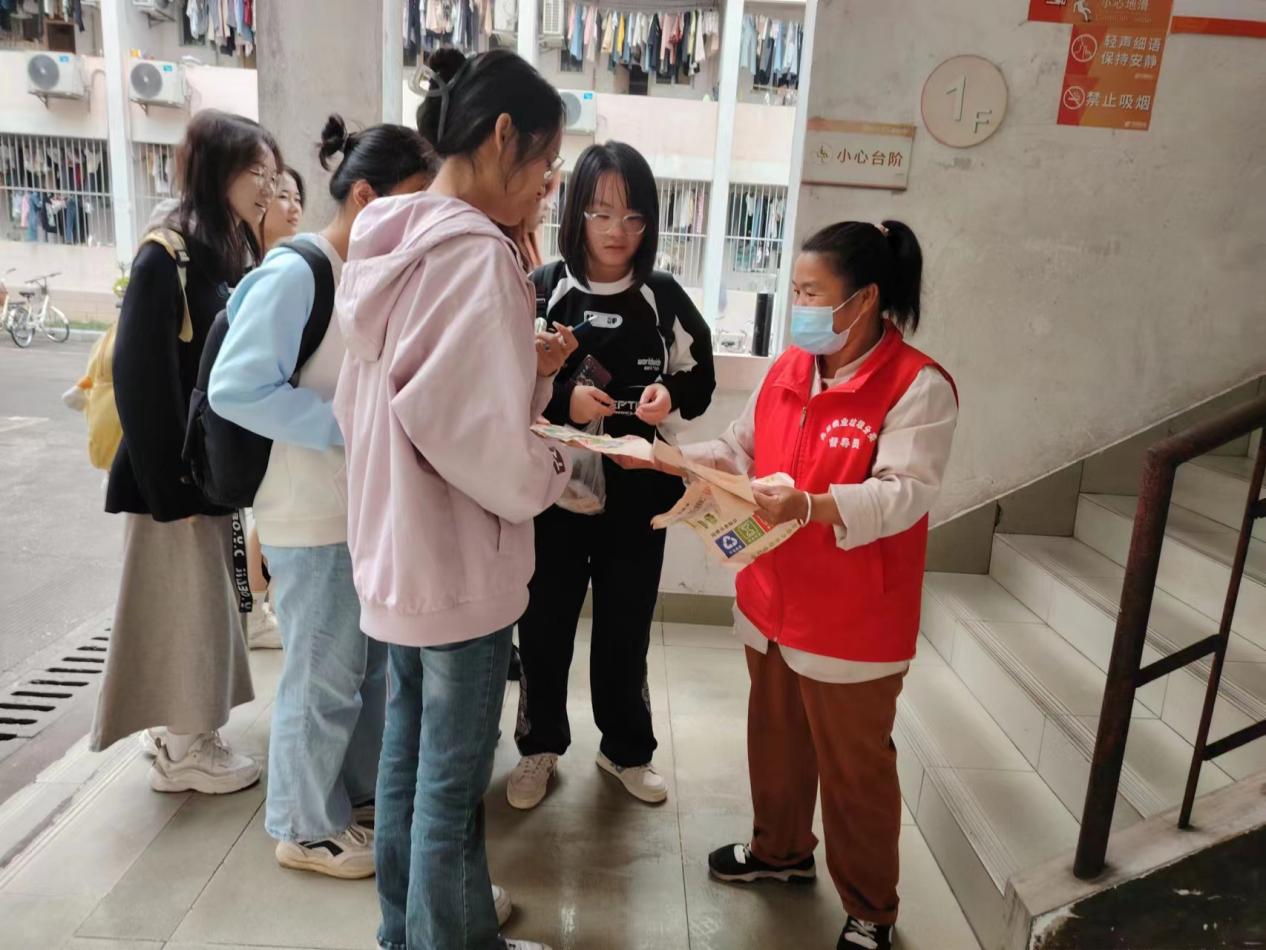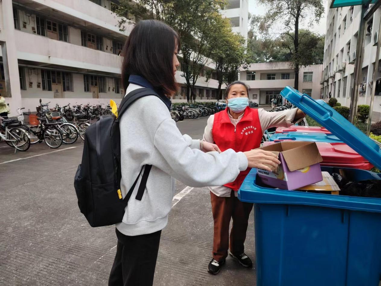 垃圾分类督导员引导同学分类垃圾