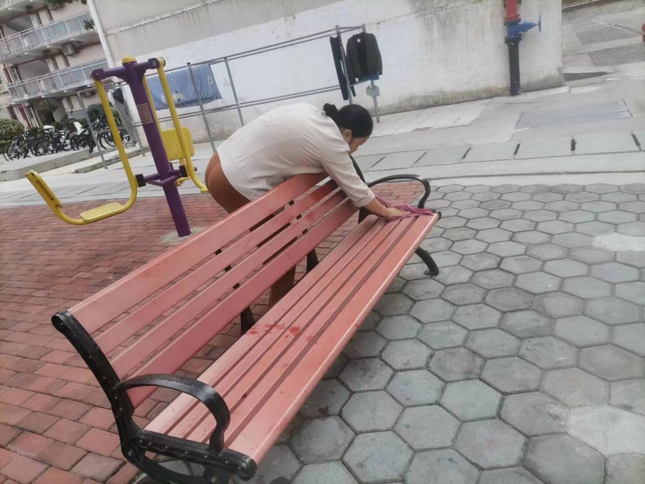 保洁人员擦拭公共长椅
