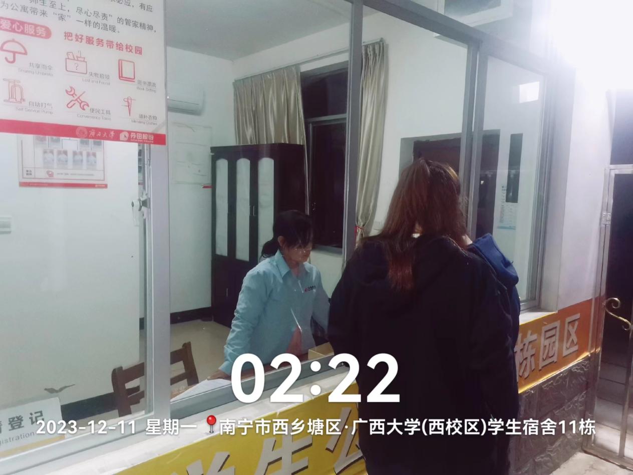 第十五周学生公寓各项服务工作有序开展,本周到宿舍走访学生154人次,回复学生反映的热水问题,洗衣机问题,公共晾衣架问题共23起;办理宿舍业务5899人次(其中办理外宿13人,调宿学生8人,新入住学生3人,其他业务121人, 晚归登记5754人次)。