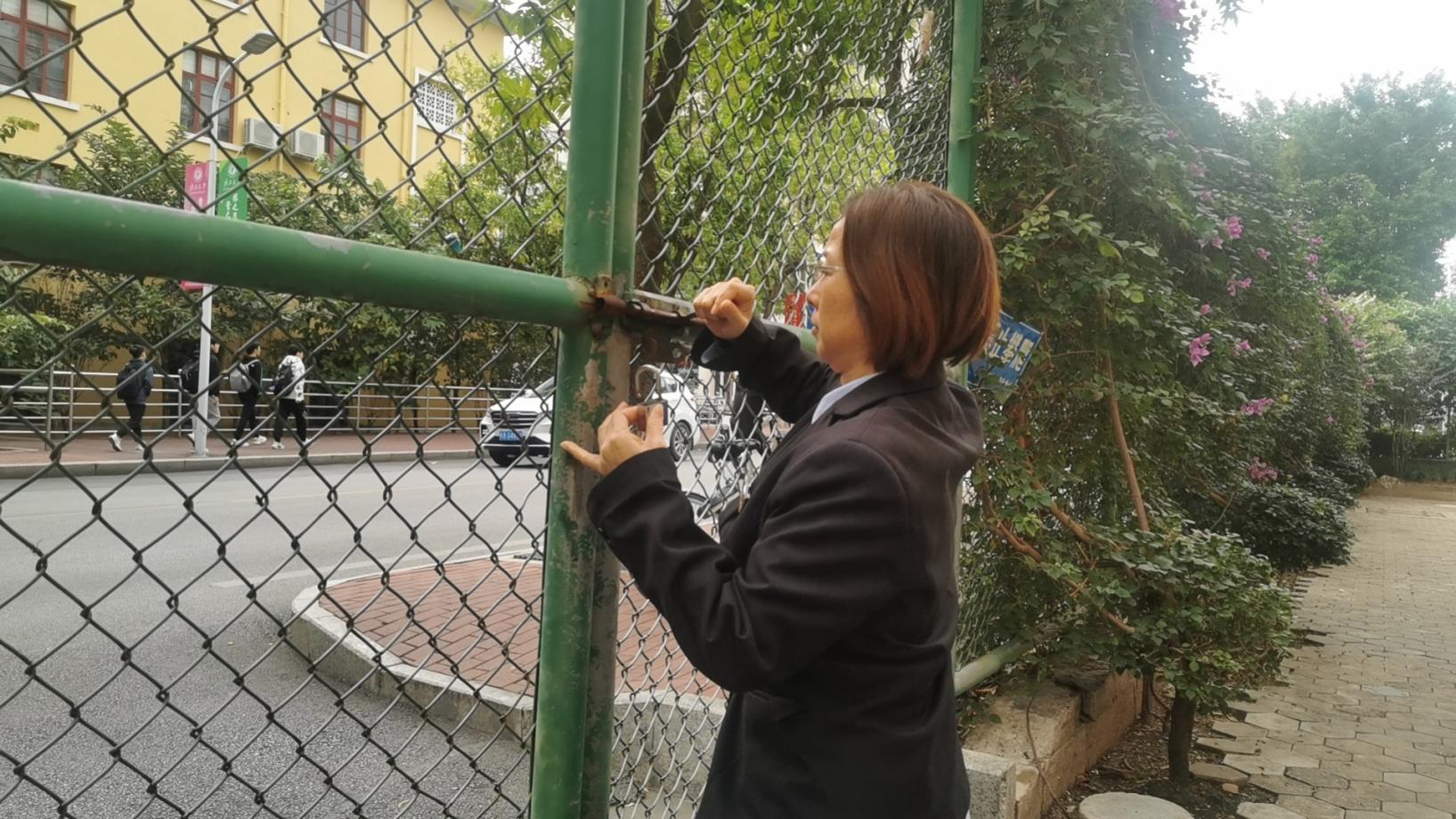 值班员检查园区消防门锁