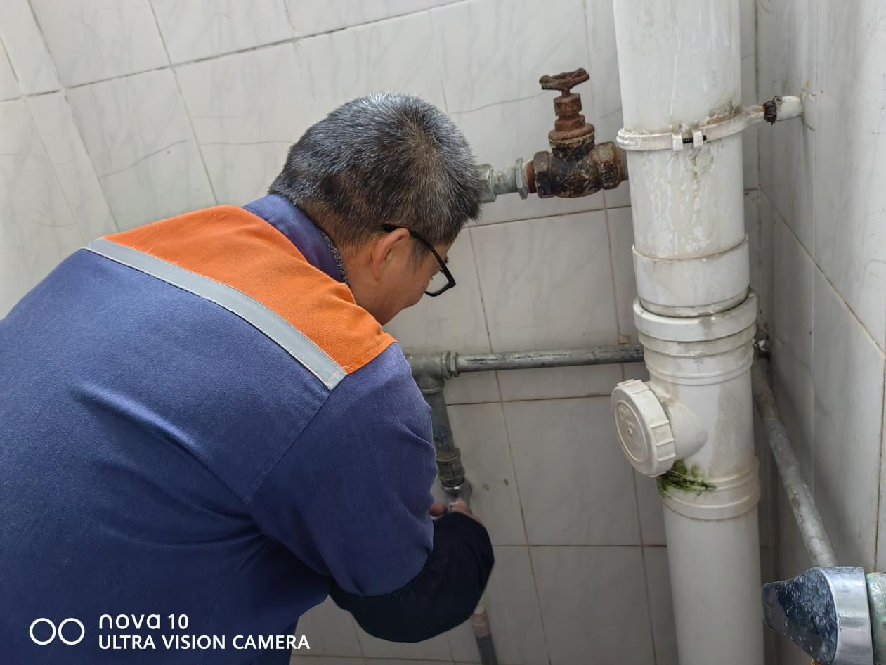 工作人员维修东1栋楼梯口水龙头