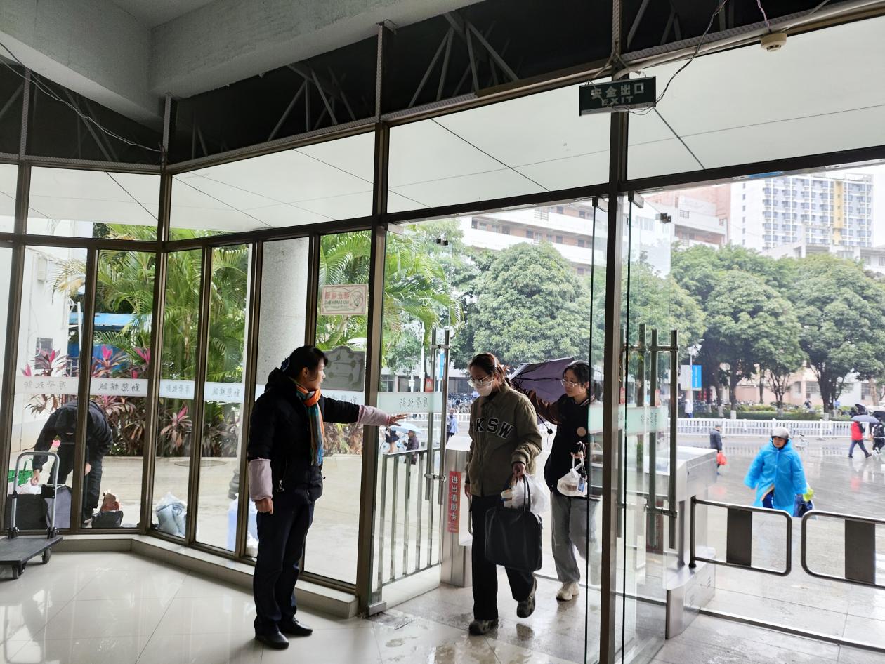 值班员站立服务,提醒同学一人一卡通行