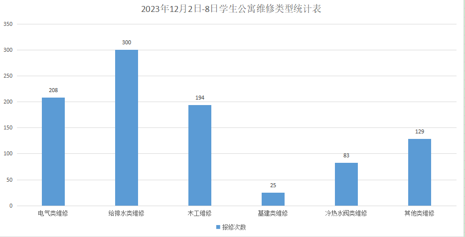 2023年12月2日-8日后勤服务24小时报修中心接电话报修、网上报修、现场报修1193单,其中学生公寓报修939单(已完工932单,完工率99.2%,余7单在维修中),其中电气类208单,木工类194单,给排水类300单,基建类25单,冷热水阀类83单,其他类129单,余下254单由其他岗位负责完成维修;在做好每天日常维修的同时,坚持对学生公寓183间电表房, 2个水泵房每天巡检。