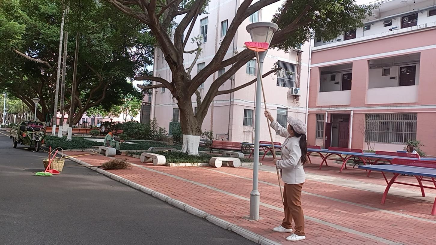 工作人员拾起同学们掉落衣物晾晒至公共晾衣架