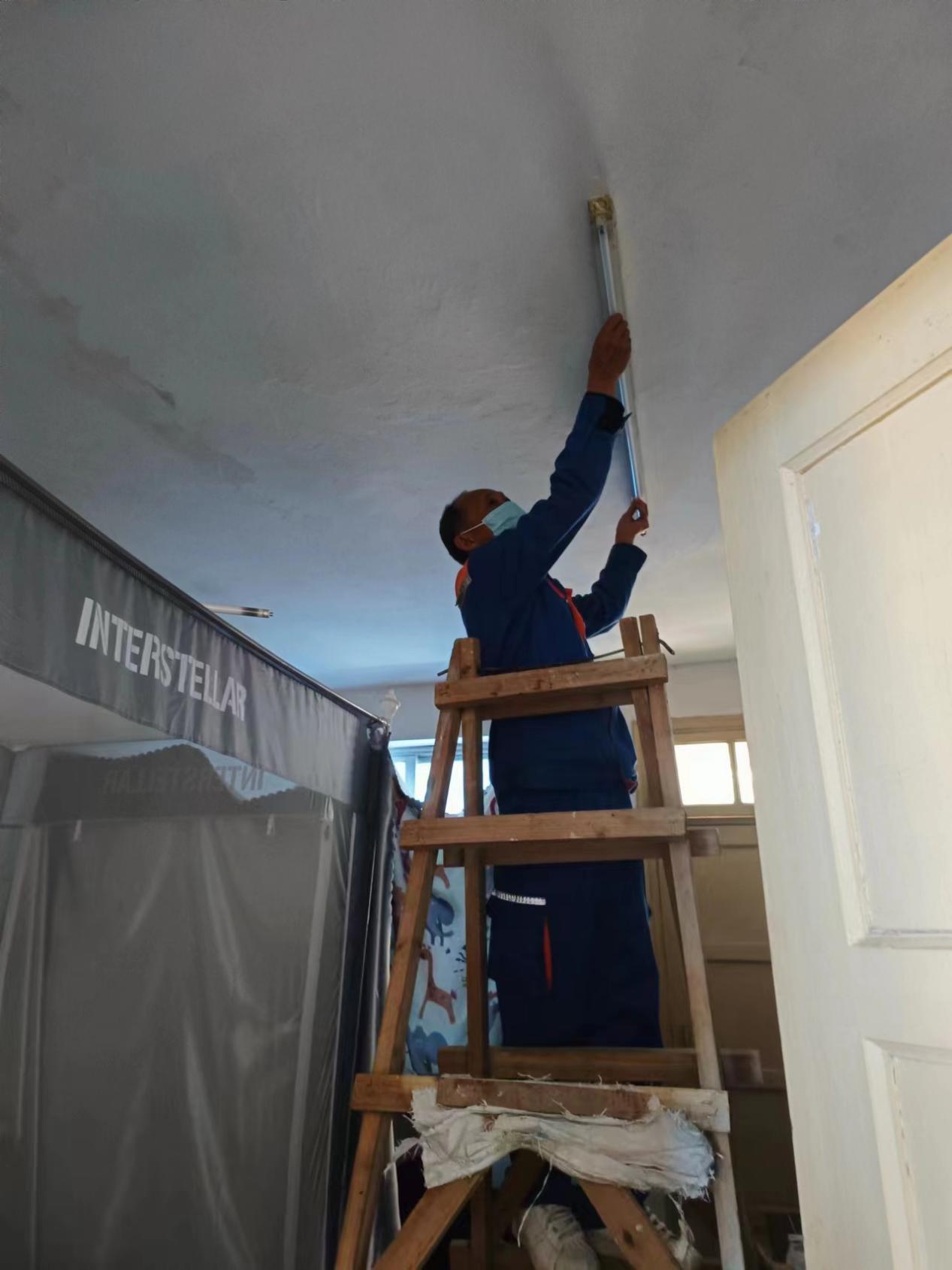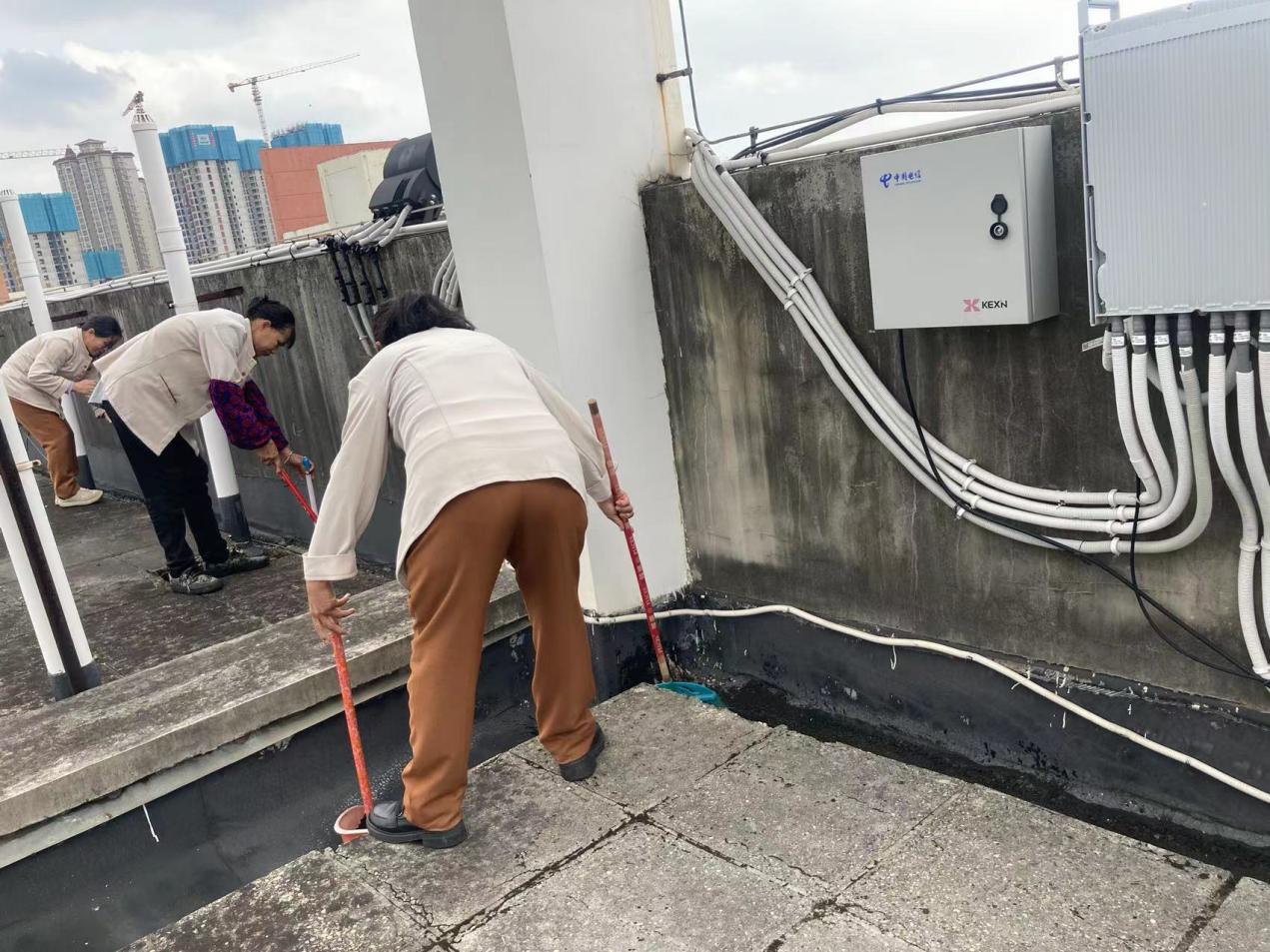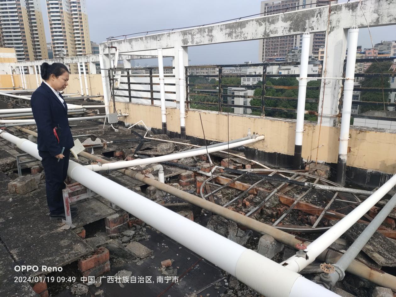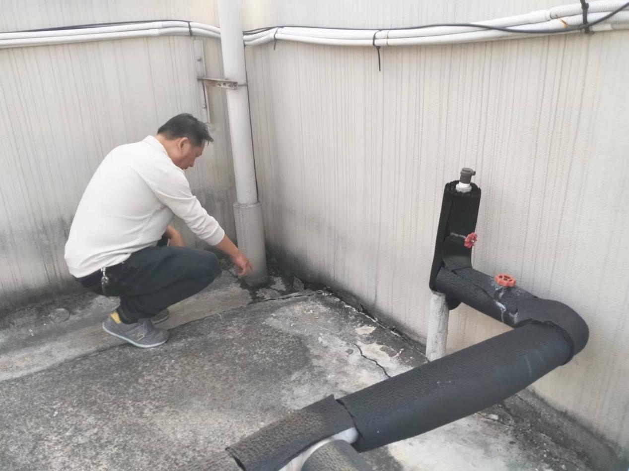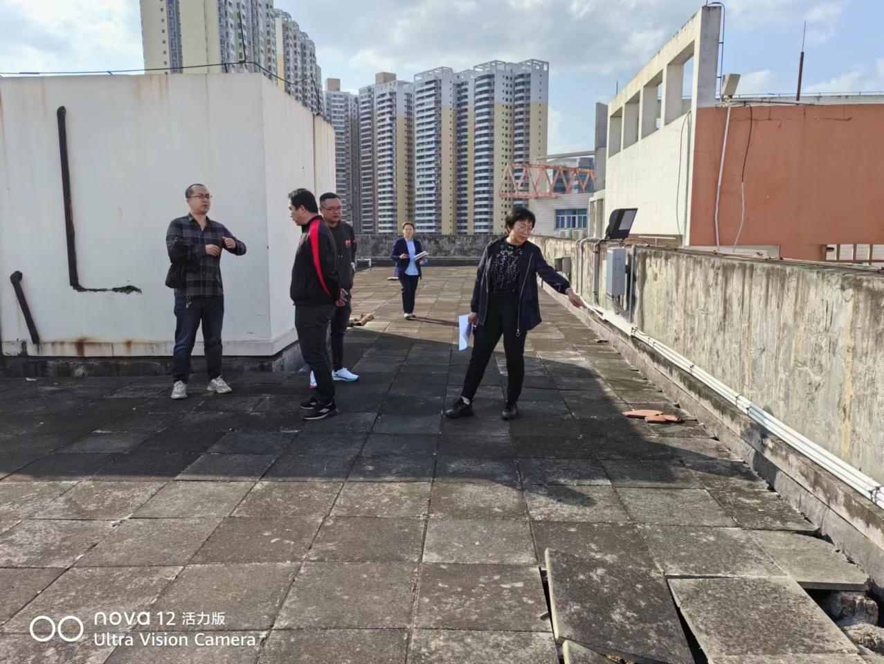 工作人员查看学生公寓查看天面漏水情况