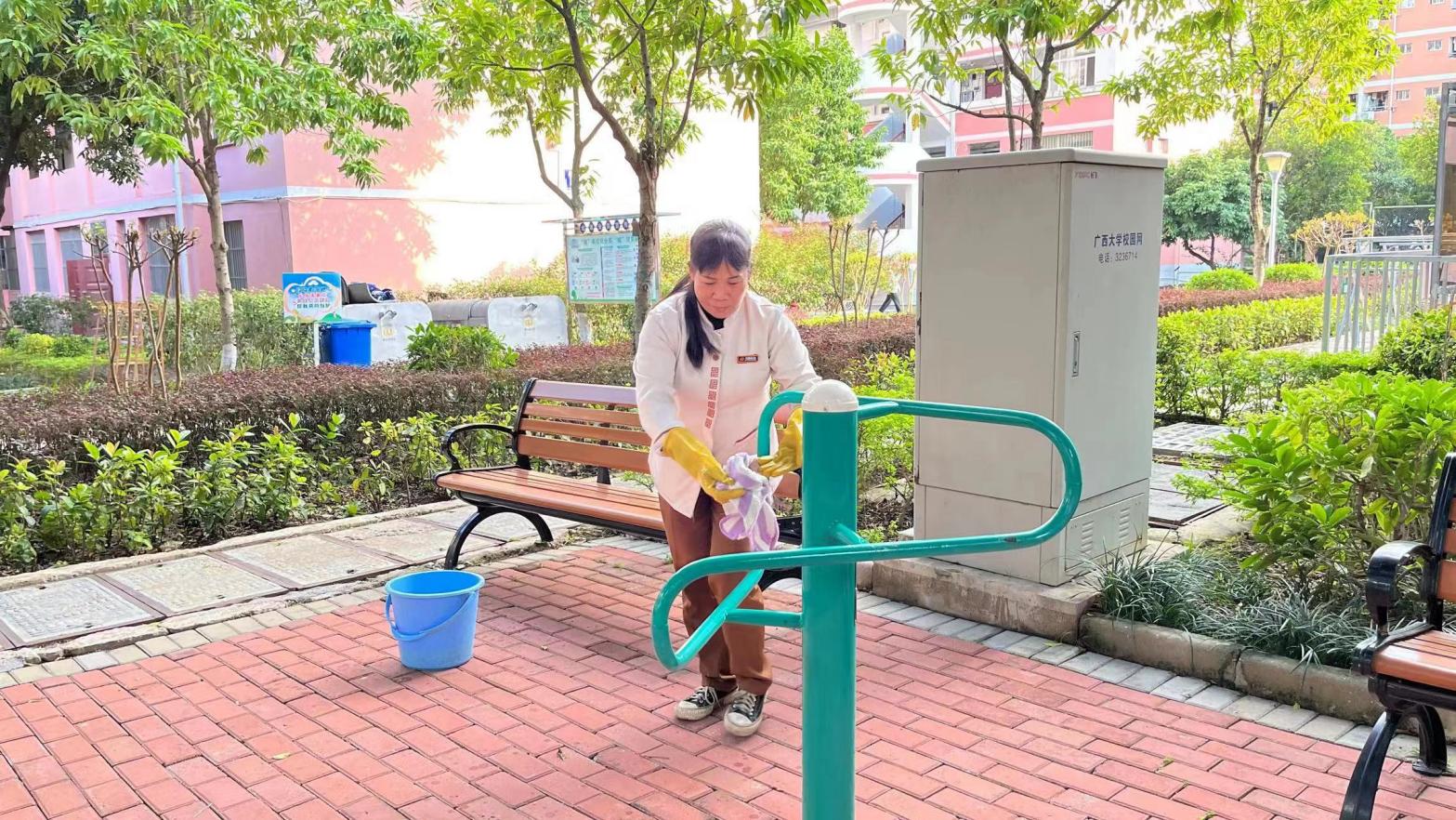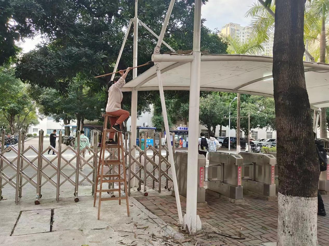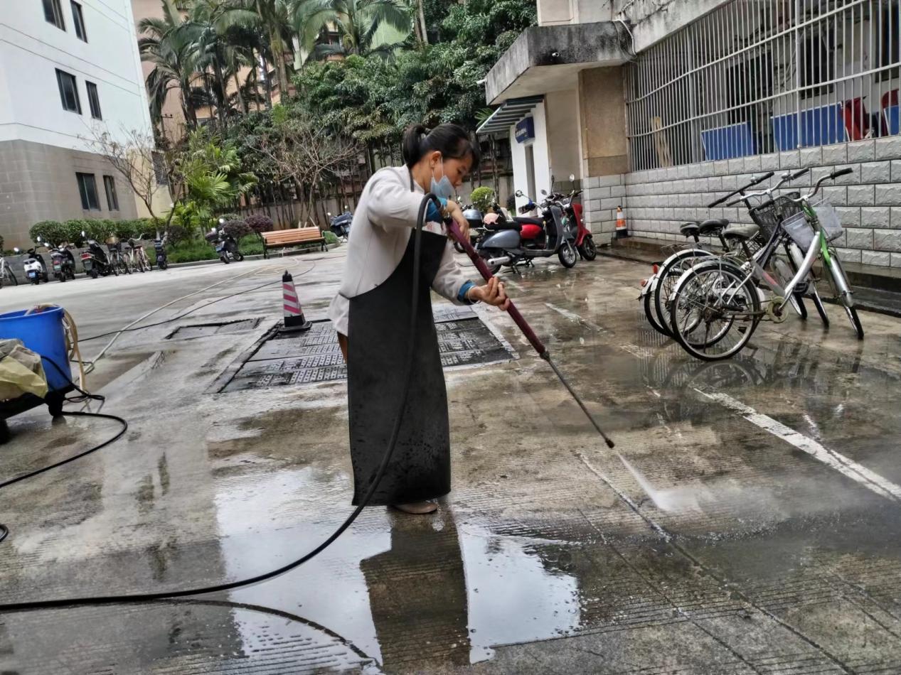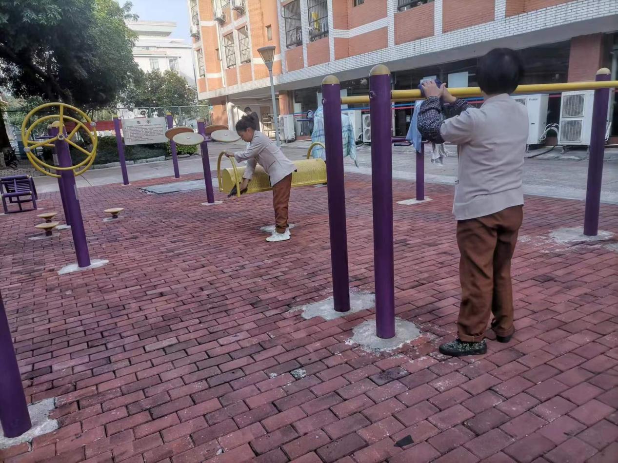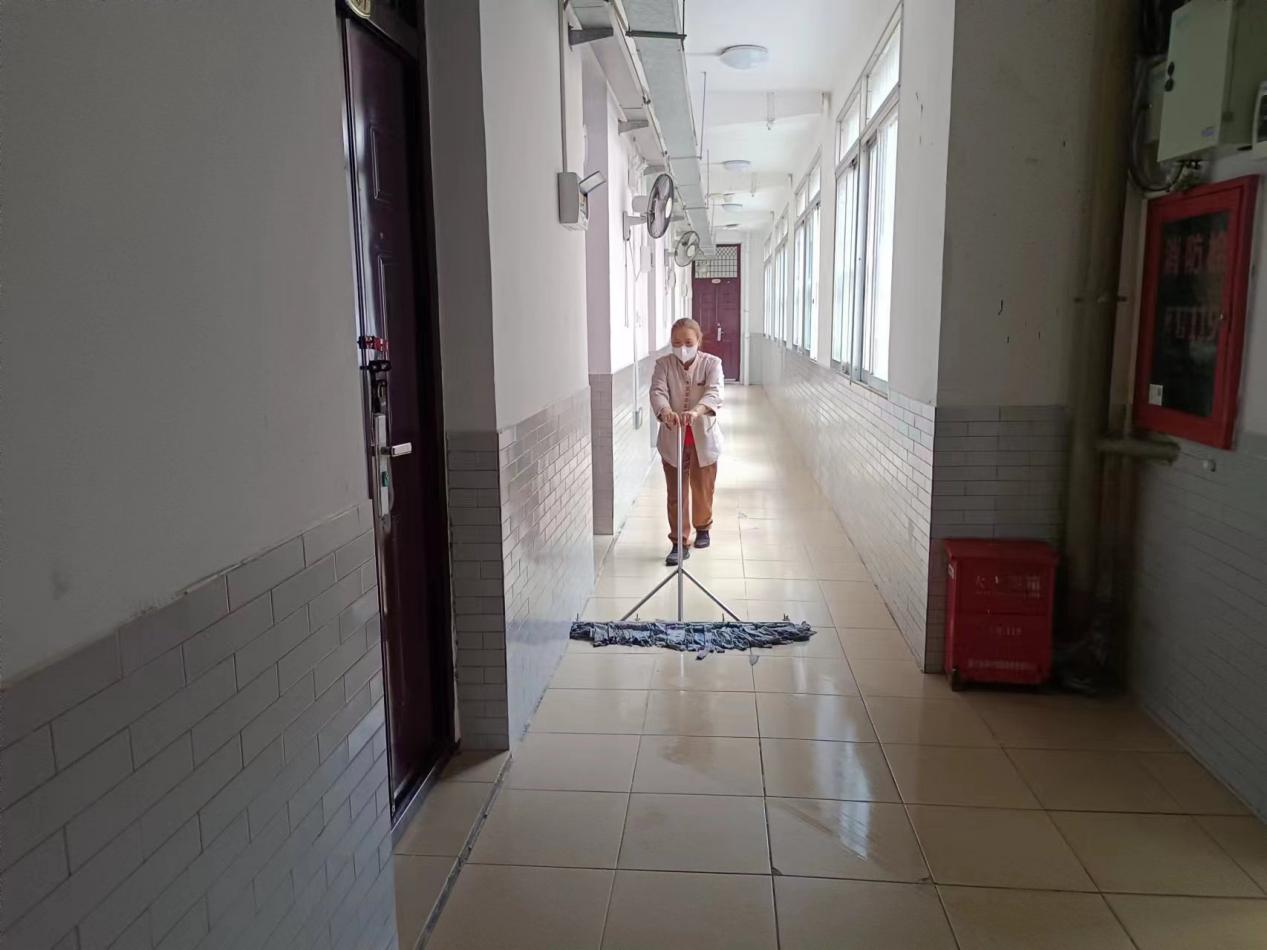 认真做好园区内各种设备设施和33间自习室的保洁维护工作。每日检测园区热水机组温度以及洗衣机的运营情况,定时检查园区消防设备设施情况。擦拭学生公寓园区内472个生活设施(其中公共长椅102张,乒乓球桌152张,晾衣架134个、健身器材84个)。