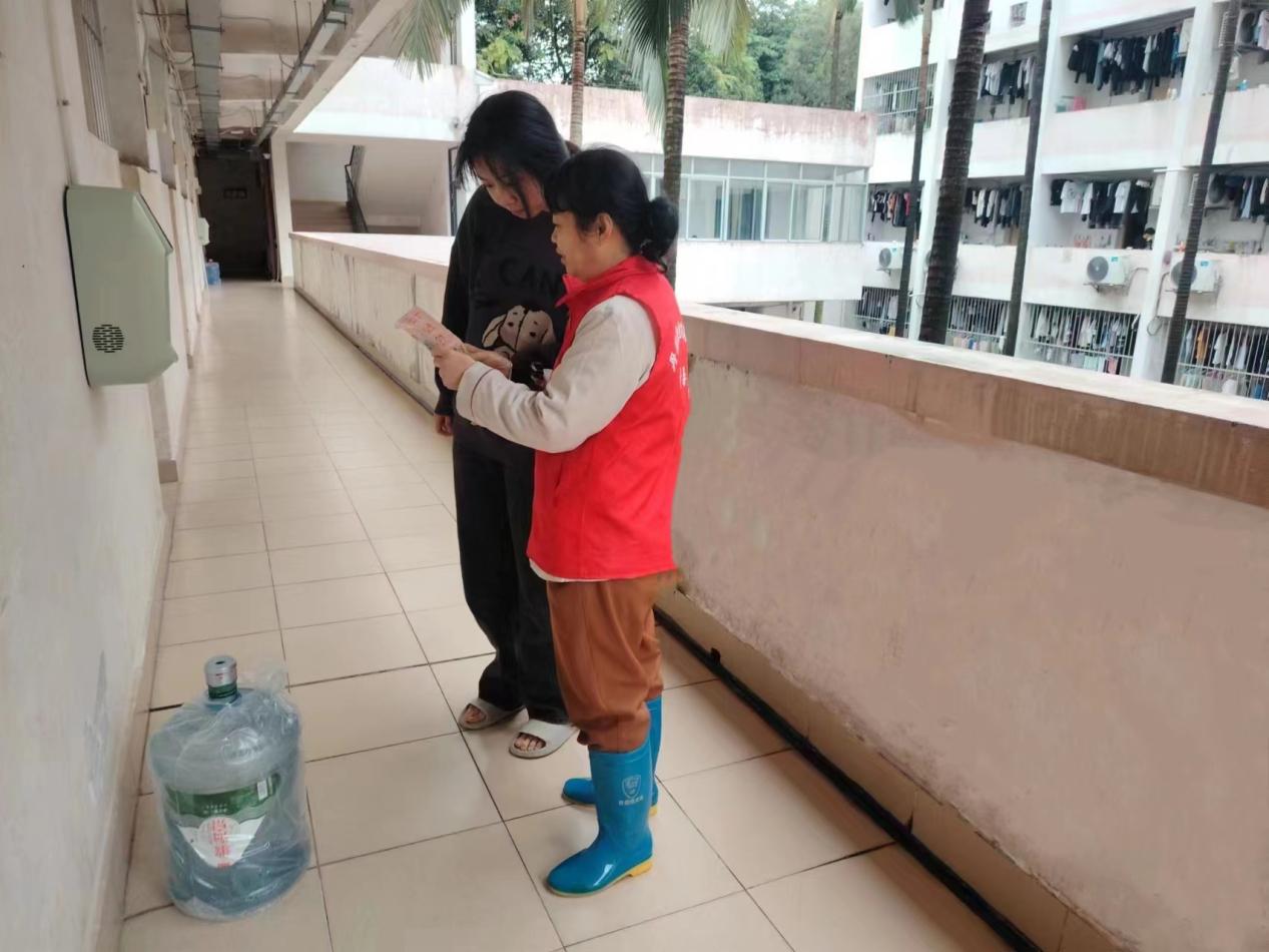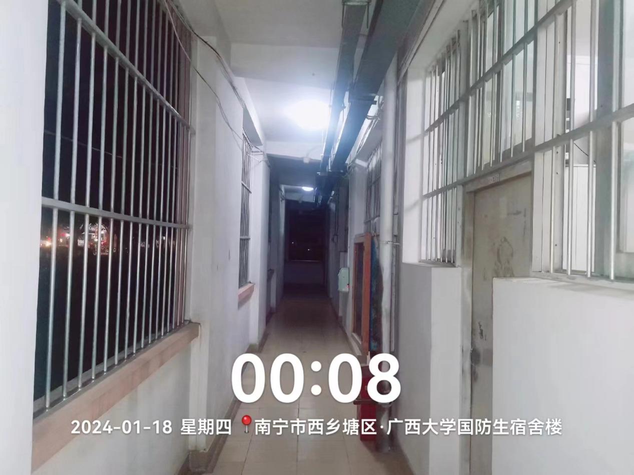 工作人员查看学生公寓走廊过道漏水情况