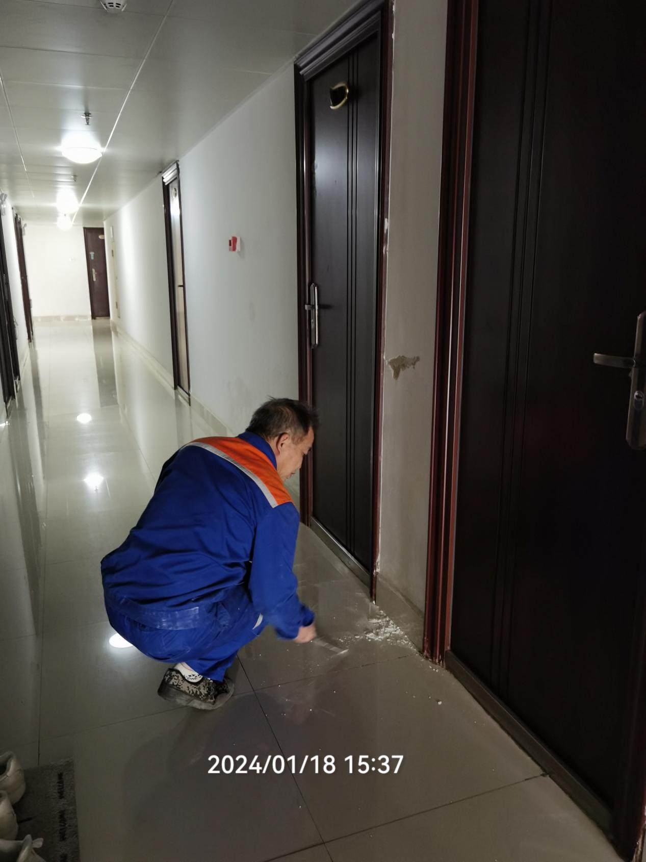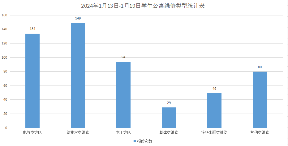 2.2024年1月13日-19日后勤服务24小时报修中心接电话报修、网上报修、现场报修720单,其中学生公寓报修535单(已完工514单,完工率96.07%,余21单在维修中),其中电气类134单,木工类94单,给排水类149单,基建类29单,冷热水阀类49单,其他类80单,余下185单由其他岗位负责完成维修;在做好每天日常维修的同时,坚持对学生公寓183间电表房, 2个水泵房每天巡检,并逐一对学生公寓围墙、高大树木、门窗、水电设施、消防设施等进行全面排查。