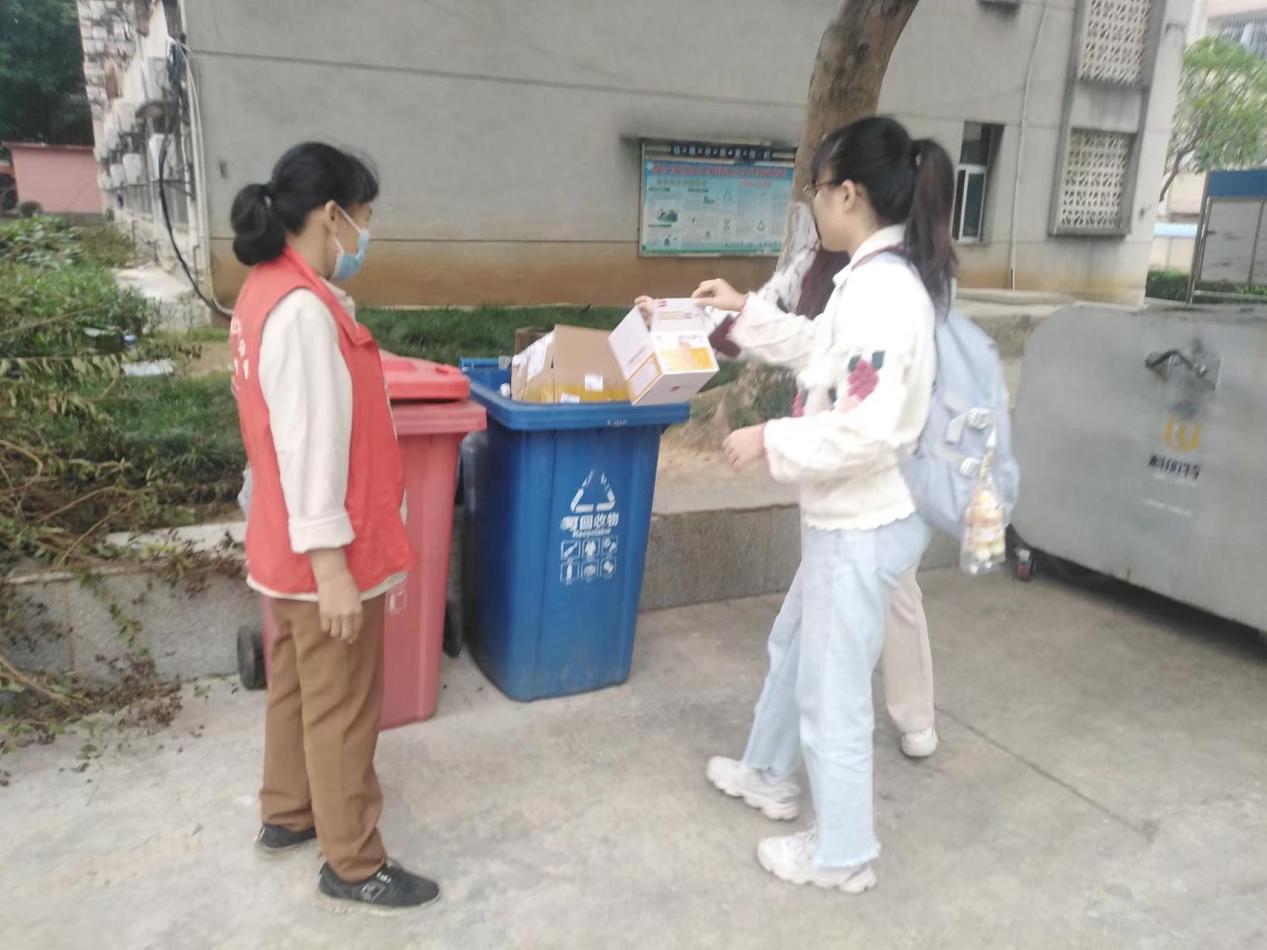 垃圾分类督导员引导同学分类垃圾