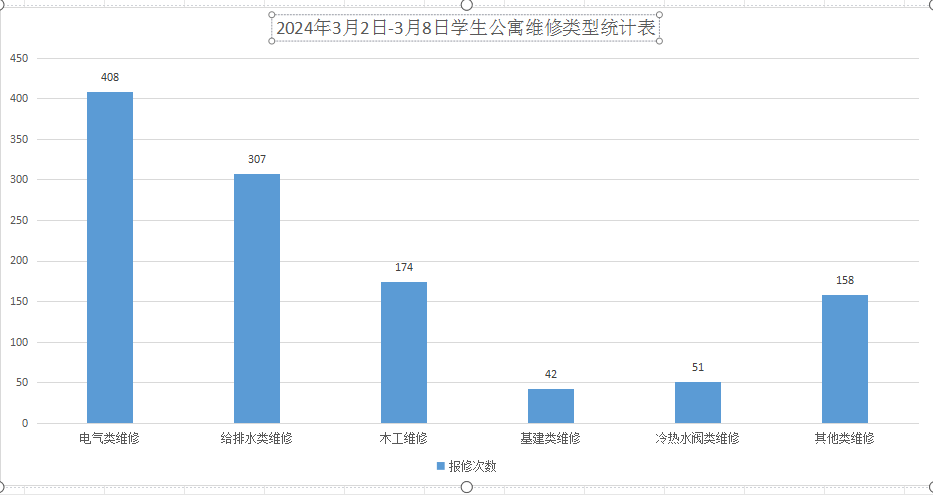 二、维修情况:2024年3月2日-8日后勤服务24小时报修中心接电话报修、网上报修、现场报修1532单,其中学生公寓报修1140单(已完工1124单,完工率98.6%,余16单在维修中),其中电气类408单,木工类174单,给排水类307单,基建类42单,冷热水阀类51单,其他类158单,余下392单由其他岗位负责完成维修;在做好每天日常维修的同时,坚持对学生公寓183间电表房, 2个水泵房每天巡检。
