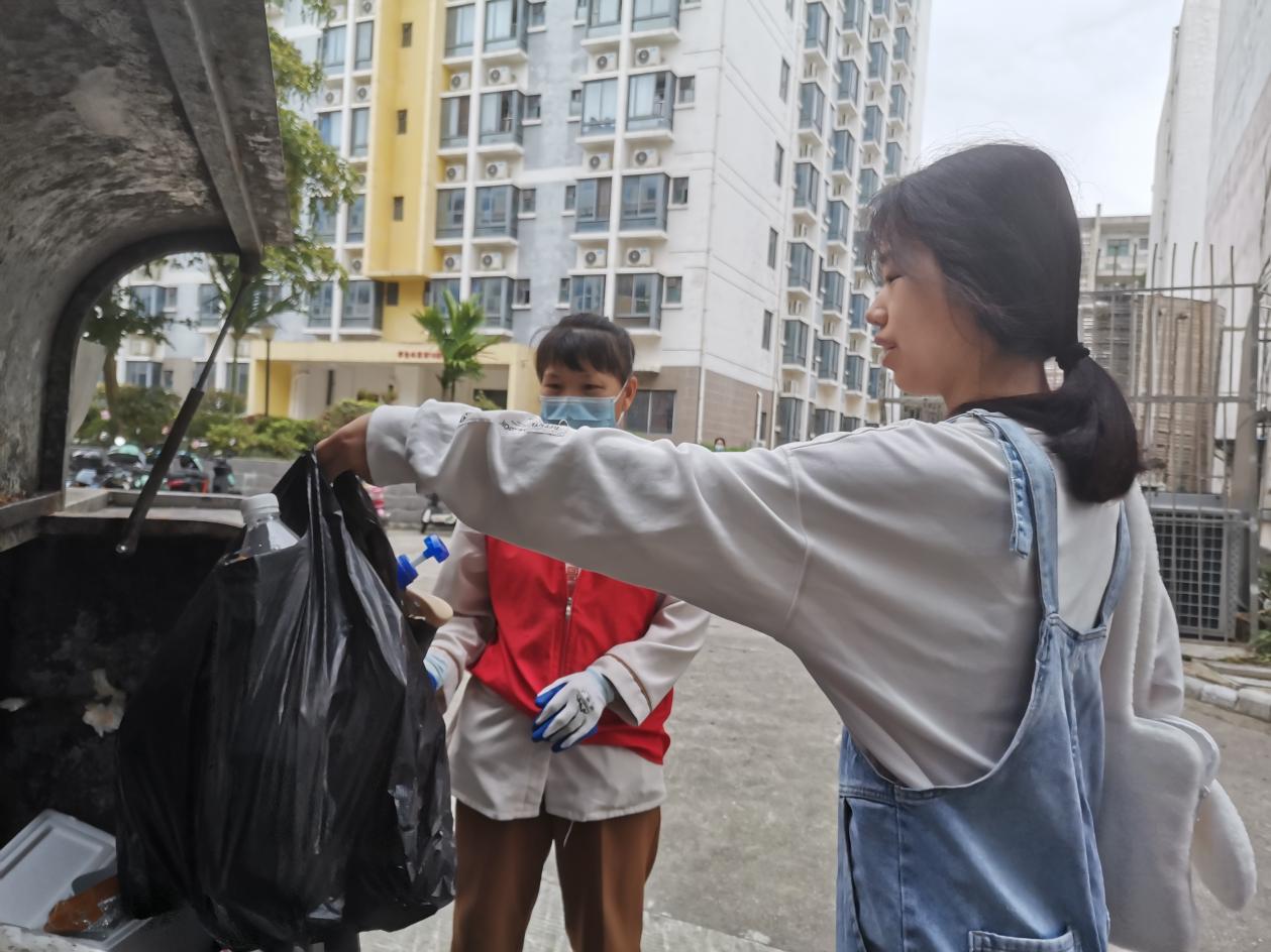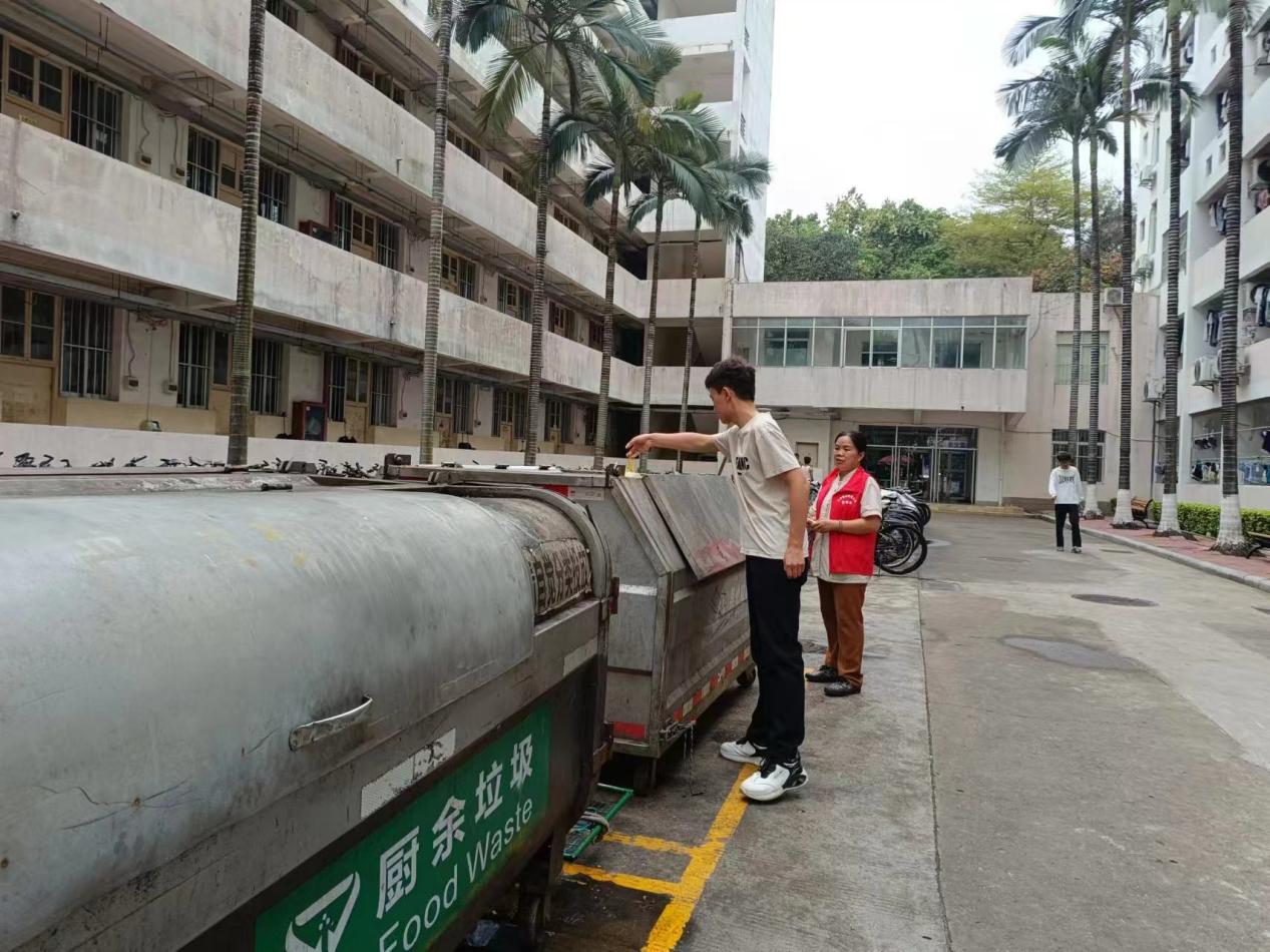 垃圾分类督导员引导同学分类垃圾