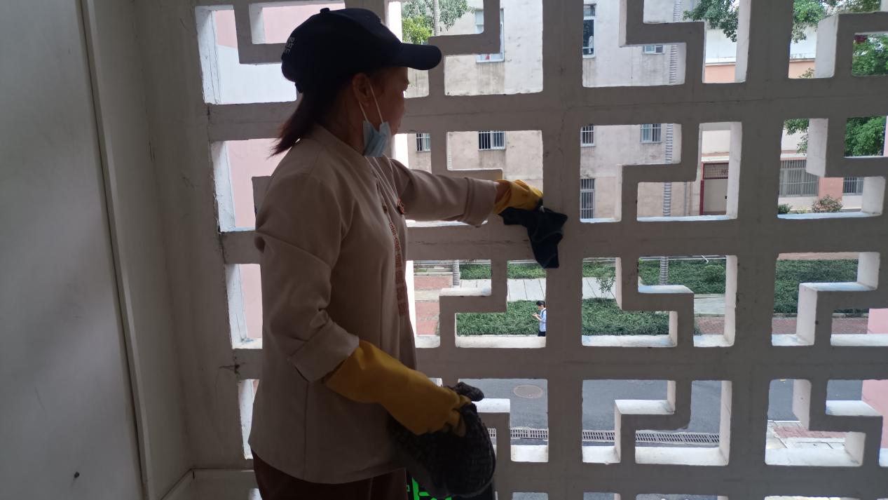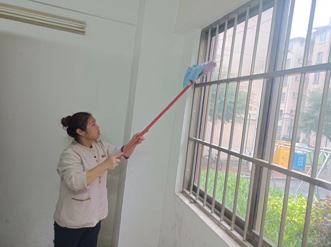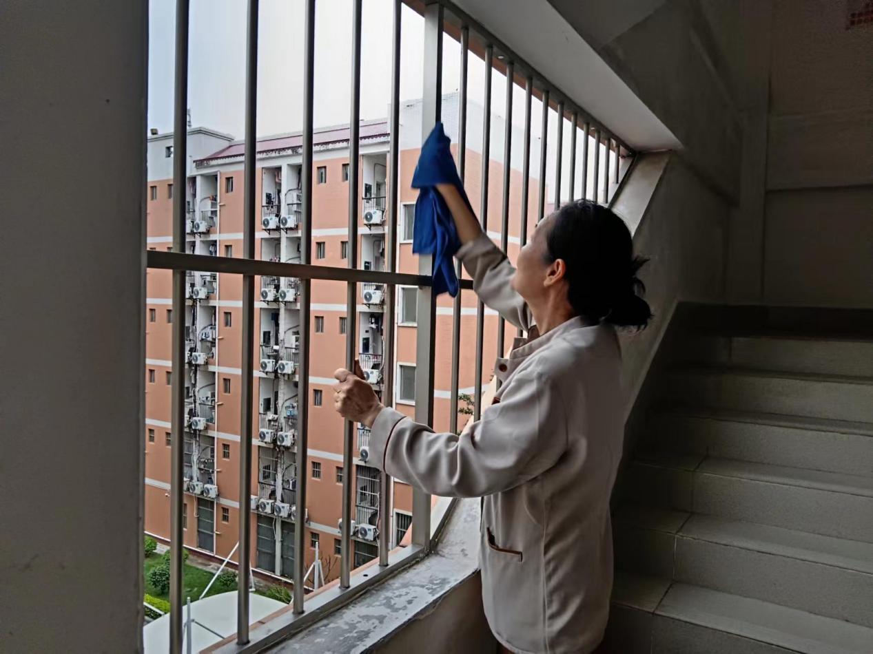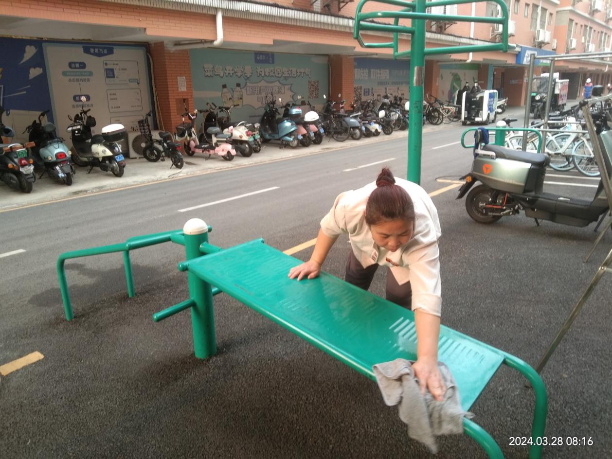 认真做好园区内各种设备设施和33间自习室的保洁维护工作。每日检测园区热水机组温度以及洗衣机的运营情况,定时检查园区消防设备设施情况。擦拭学生公寓园区内472个生活设施(其中公共长椅102张,乒乓球桌152张,晾衣架134个、健身器材84个)。