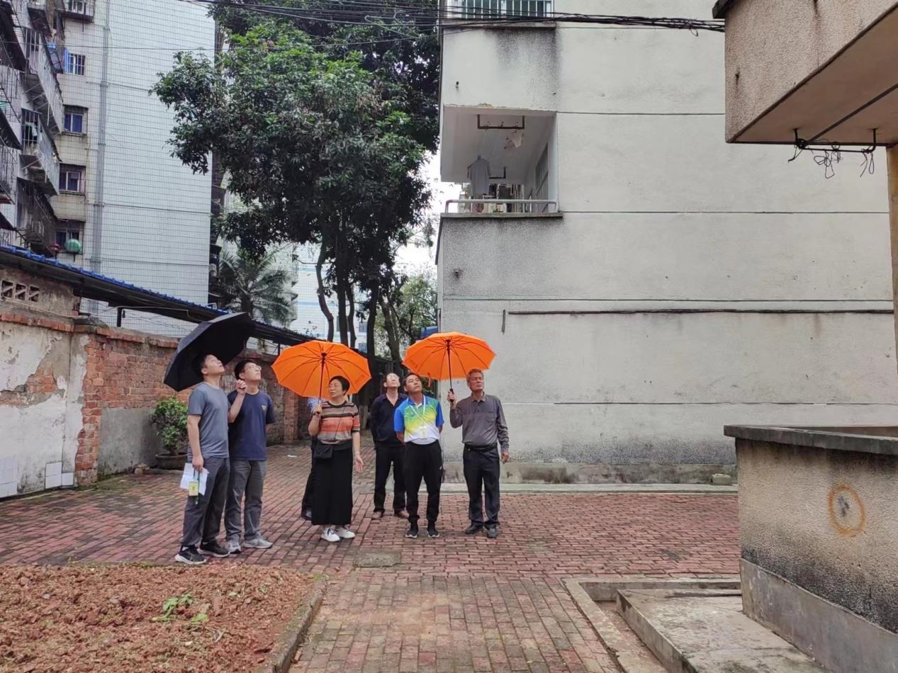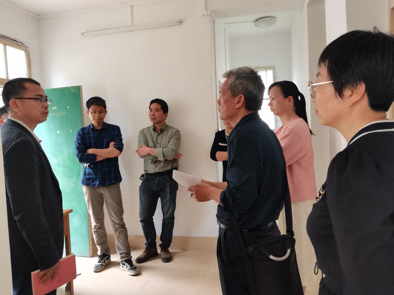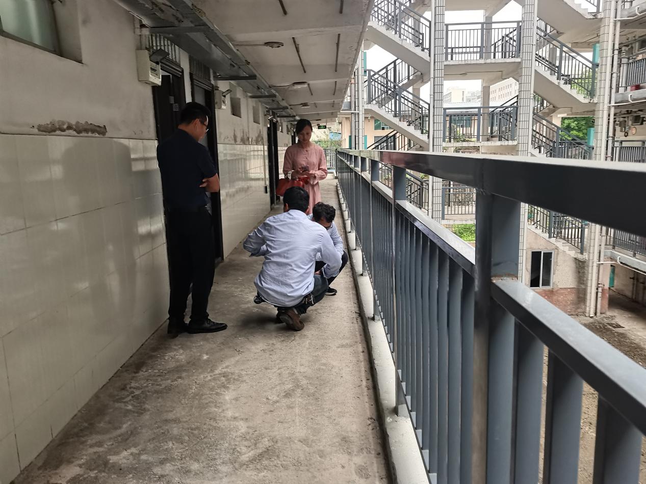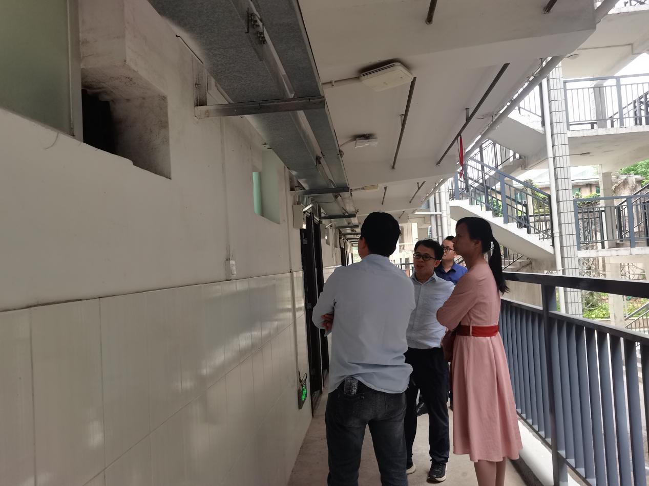 工作人员与学院老师现场查看南1栋情况
