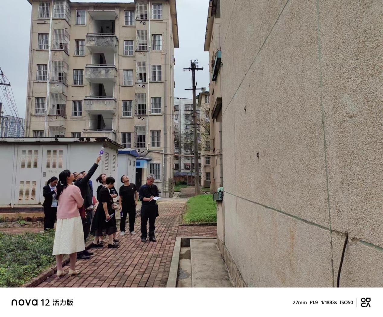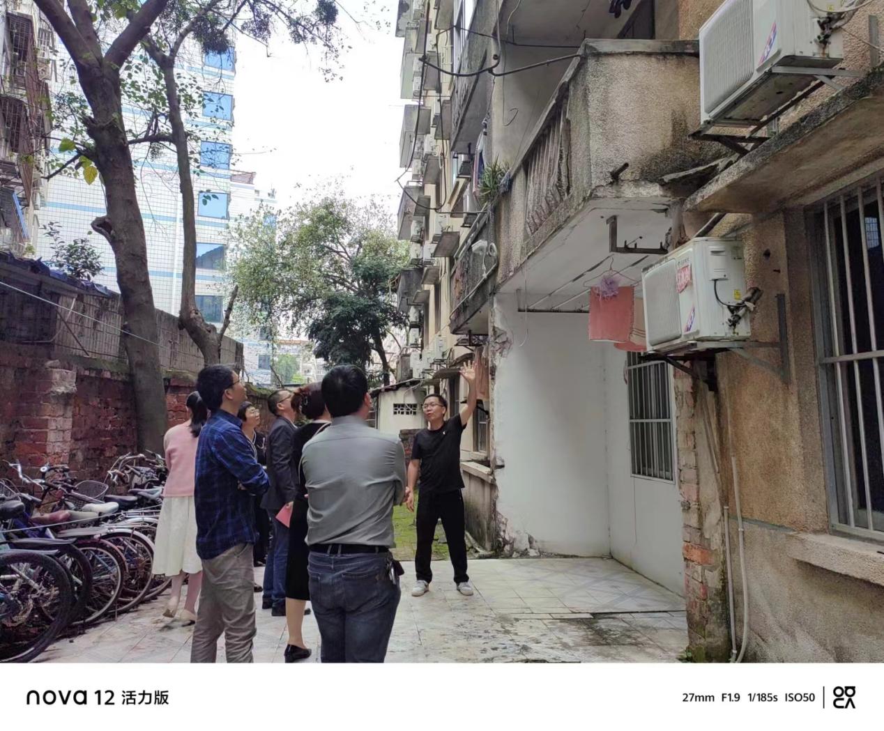 工作人员和设计公司现场勘查西28栋项目施工内容