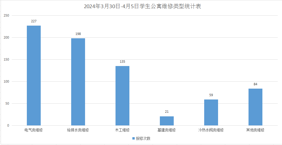 二.2024年3月30日-4月5日后勤服务24小时报修中心接电话报修、网上报修、现场报修1214单,其中学生公寓报修724单(已完工709单,完工率97.9%,余15单在维修中),其中电气类227单,给排水类198单,木工类135单,基建类21单,冷热水阀类59单,其他类84单,余下490单由其他岗位负责完成维修;在做好每天日常维修的同时,坚持对学生公寓183间电表房, 2个水泵房每天巡检。