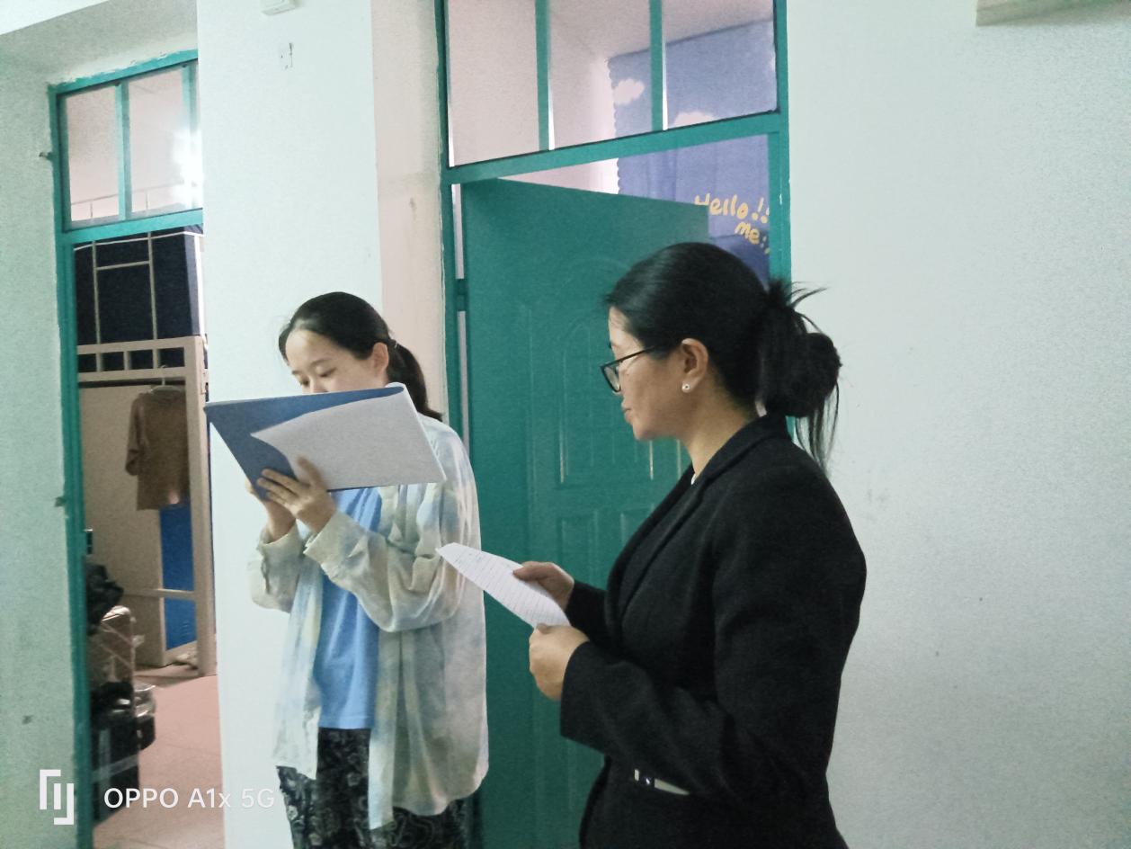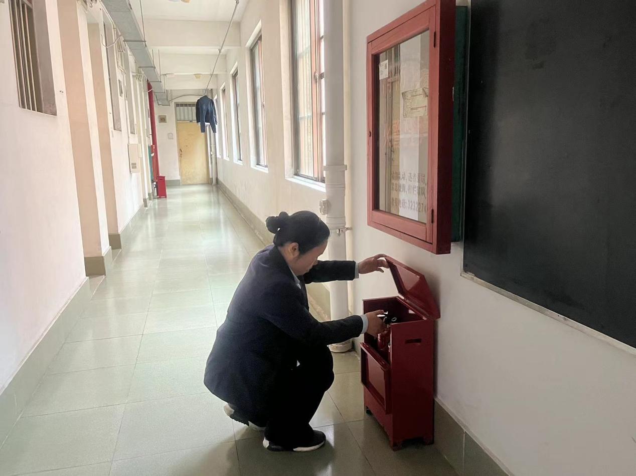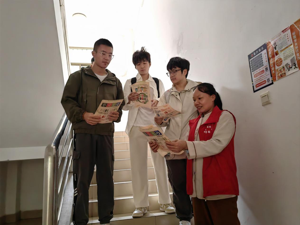劳动教育老师指导宿舍巡查体验岗同学检查消防器材