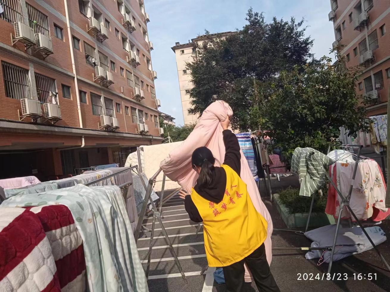 宿舍管理体验岗同学整理公共晾衣架掉落衣物