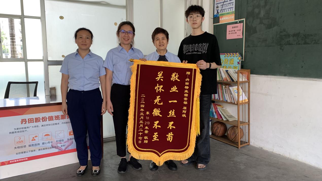 3月31日,集团大院的宿管阿姨收到学生送来写有“敬业一丝不苟 关怀无微不至”的锦旗一面,以此感谢宿管阿姨在他发病时给予的帮助和关爱。
