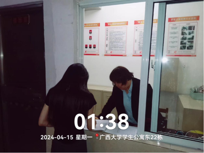 春季第八周学生公寓各项服务工作有序开展,本周到宿舍走访学生93人次,帮助学生解决洗衣机、天面漏水等问题共3起;办理宿舍业务4946人次(其中办理外宿5人,调宿学生9人,新入住学生1人,其他业务93人, 晚归登记4838人次)。