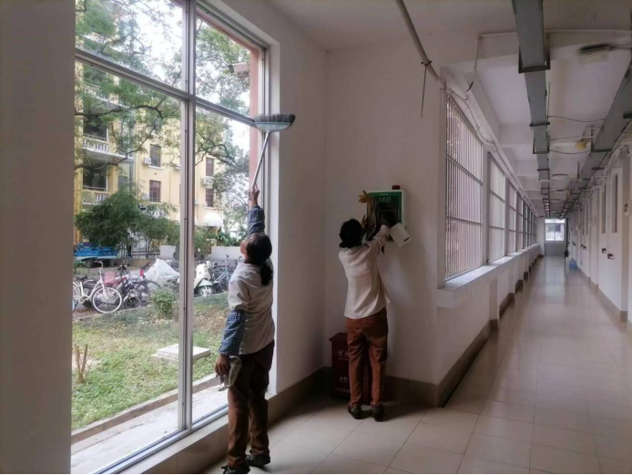 为营造学生公寓园区宜学宜居的环境,认真做好园区内消防设备设施、热水机组、洗涤设备等各种设备设施和33间自习室的保洁维护工作;做好学生公寓园区内472个生活设施(其中公共长椅102张,乒乓球桌152张,晾衣架134个、健身器材84个)的维护工作。